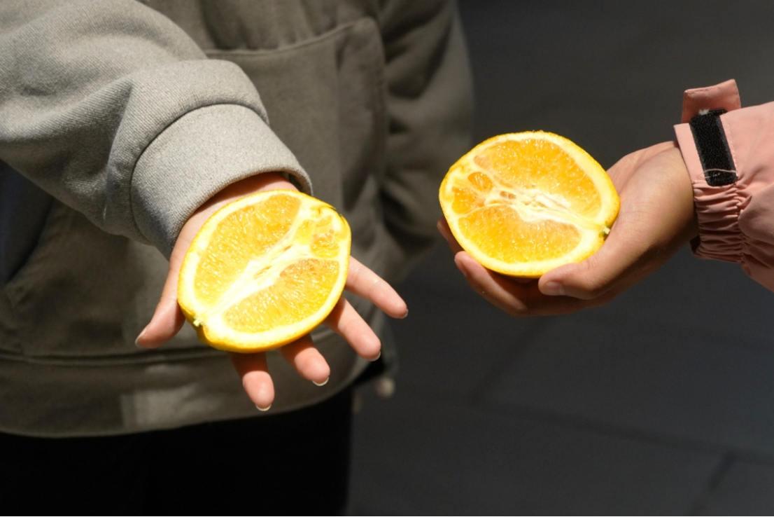 仪式现场还设置有脐橙试吃与创意打卡区,吸引了众多嘉宾驻足。大家品尝着清甜脐橙,积极交流互动,现场气氛热烈。