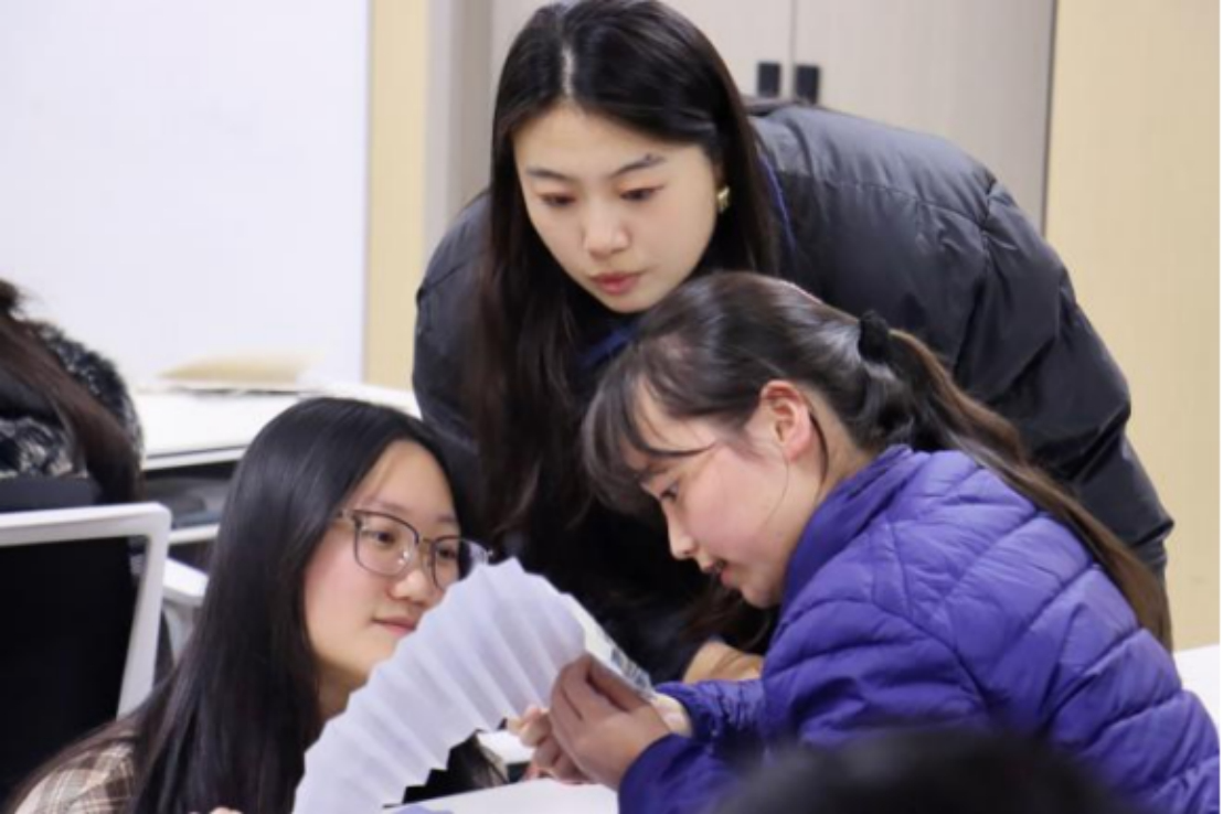 活动中,工作室提前准备了完整的书灯制作教学视频,清晰展示了书灯从基础折叠到复杂三角组合的全过程。教学视频在活动现场循环播放,方便参与者随时对照参考。随着制作的推进,纸张在同学们手中经过一次次精准对折与翻压,逐渐显现出立体灯罩的雏形。活动现场气氛专注而轻松,当遇到关键的“三角折叠”等难点步骤时,同学们或放缓动作反复观看视频细节,或与身旁同伴低声交流、互相观察做法。这种自主探索与邻座互学的模式,让制作过程更添一份沉浸与互动乐趣。随着时间推移,一盏盏造型典雅的古风书灯在桌面上陆续成型——纸质灯罩本身已展现出独特的光影层次与结构之美。