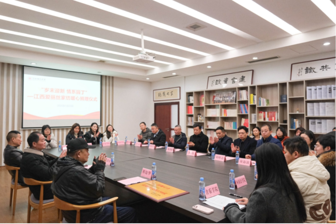 1月23日,“岁末迎新 情系园丁”江西爱丽丝家纺暖心捐赠仪式在我校先骕楼四楼统战之家举行。江西爱丽丝家纺有限公司总经理杭德虎、副总经理罗国念、销售经理程德华,校党委常委、副校长董圣鸿及相关部门负责人、辅导员代表参与活动。