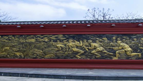 走出室内展区,园区里的金色浮雕墙以极具冲击力的艺术形式,再现了九江儿女投身革命的壮烈场景。战士们冲锋的姿态、民众支援的身影,在金色的浮雕中凝固成永恒,让我们直观感受到那段岁月的热血与豪情。