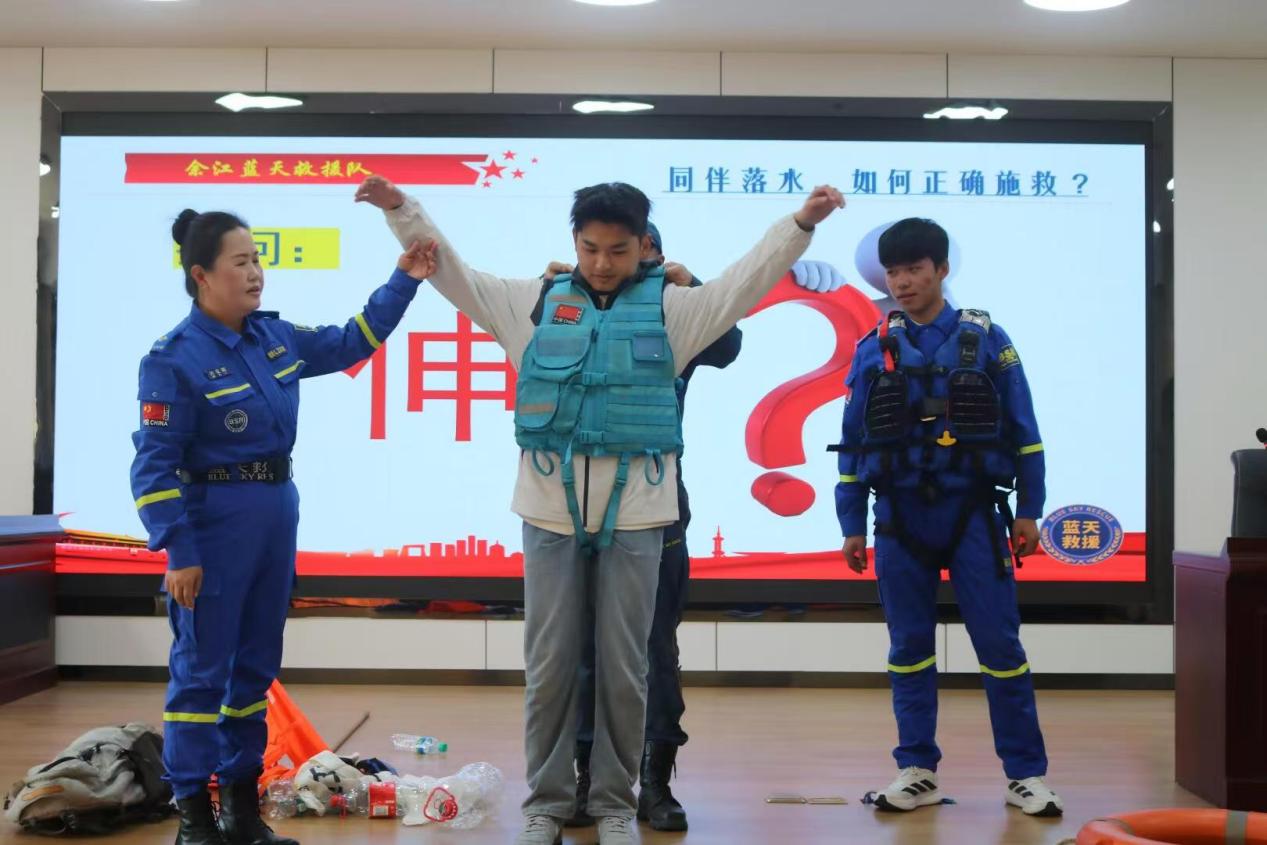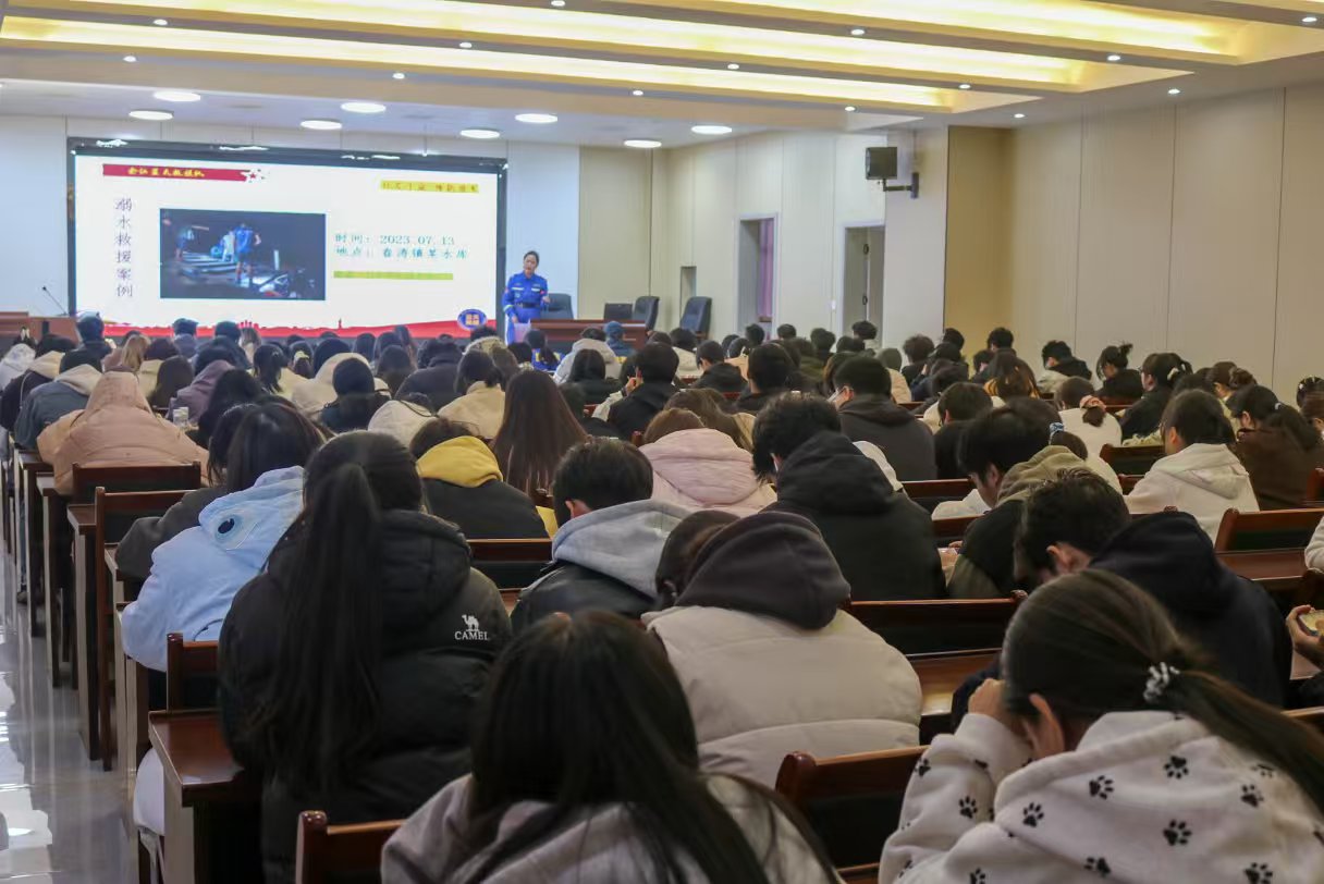 12月30日下午,由余江区蓝天救援队主办,校文明实践中心与知行书院联合承办的防溺水安全讲座在一站式B104开展,余江区蓝天救援队常务副队长、妇联主席孙亚莉为知行书院130多名学生开展有关防溺水主题宣传教育活动。