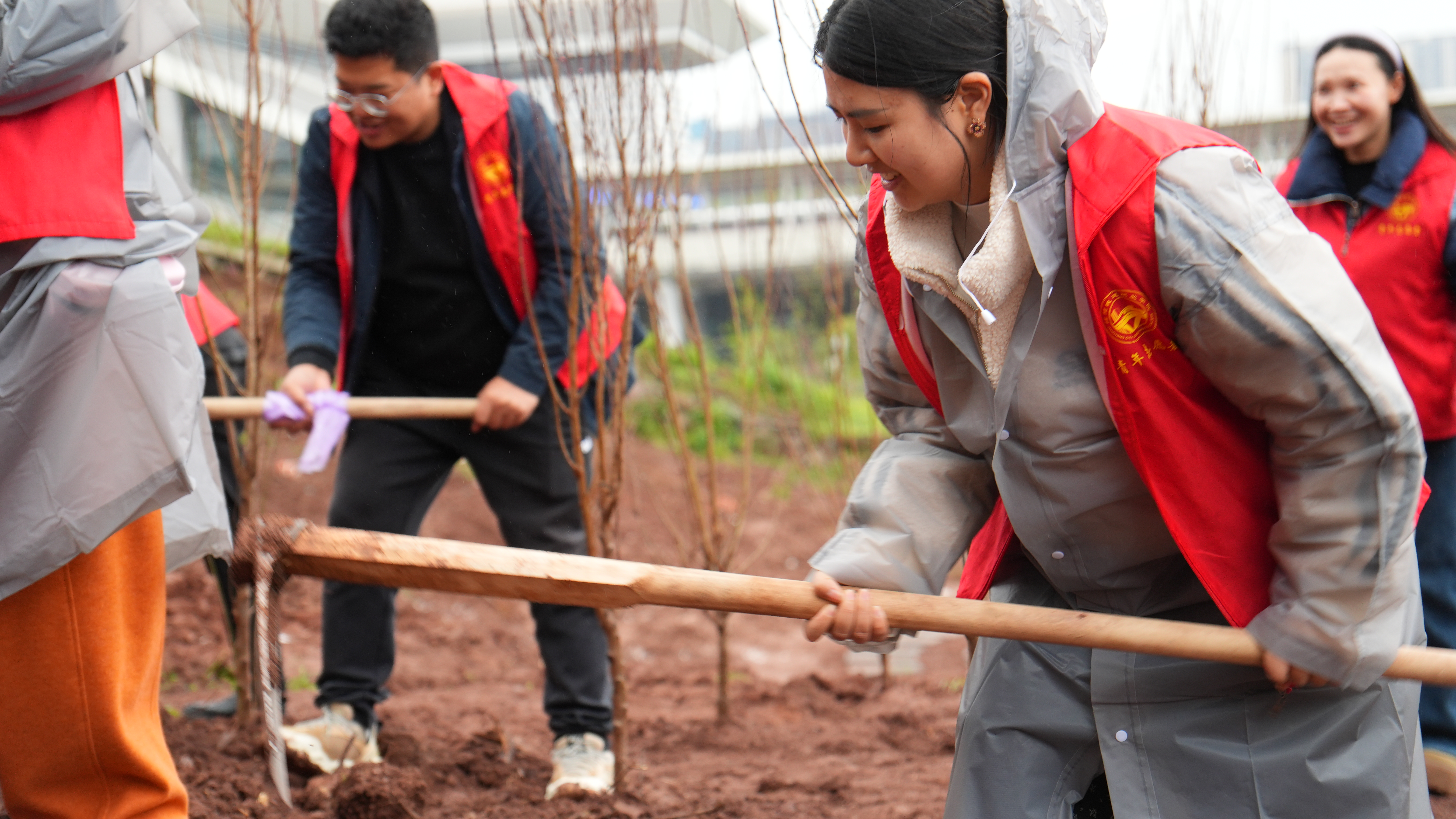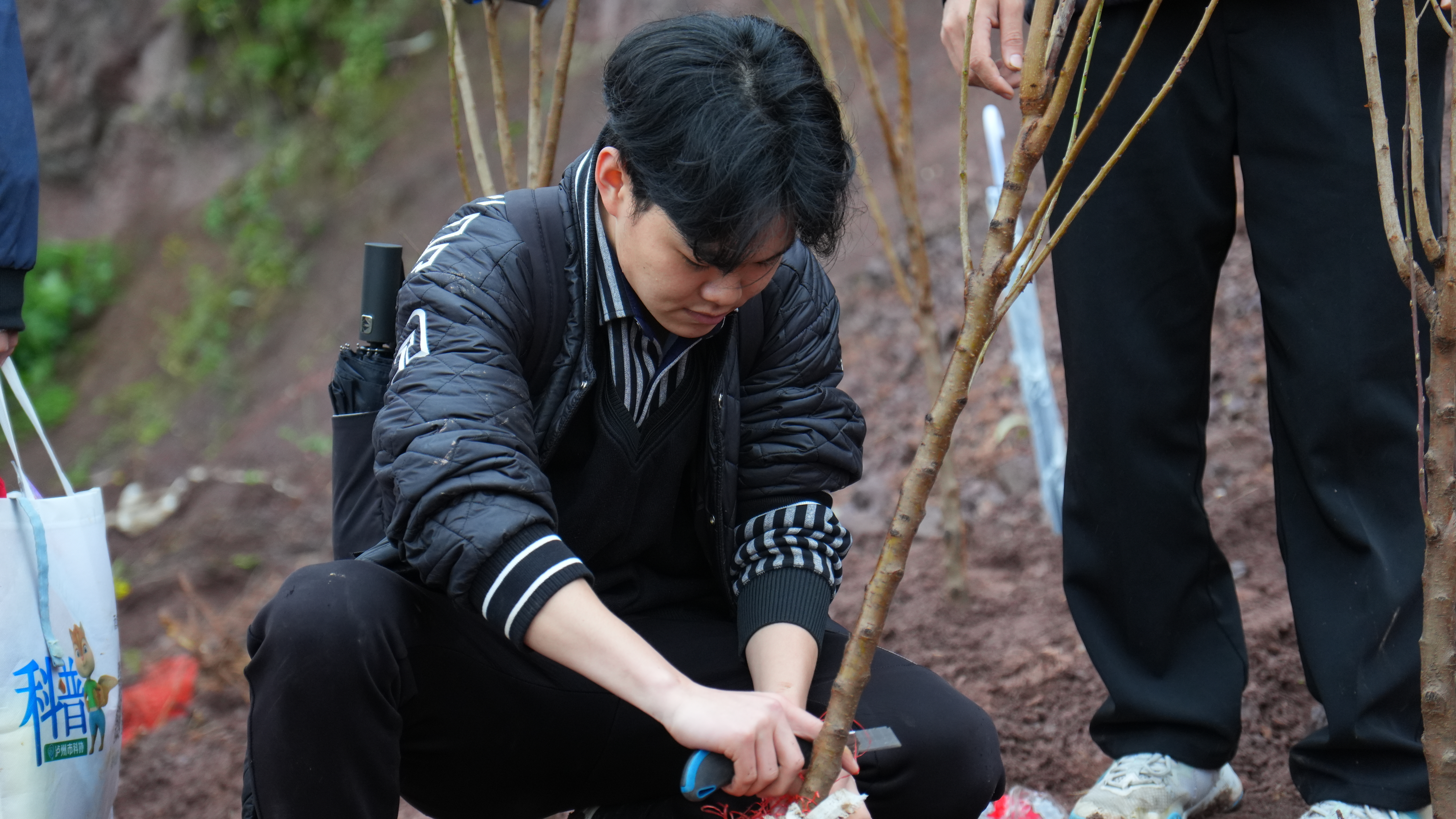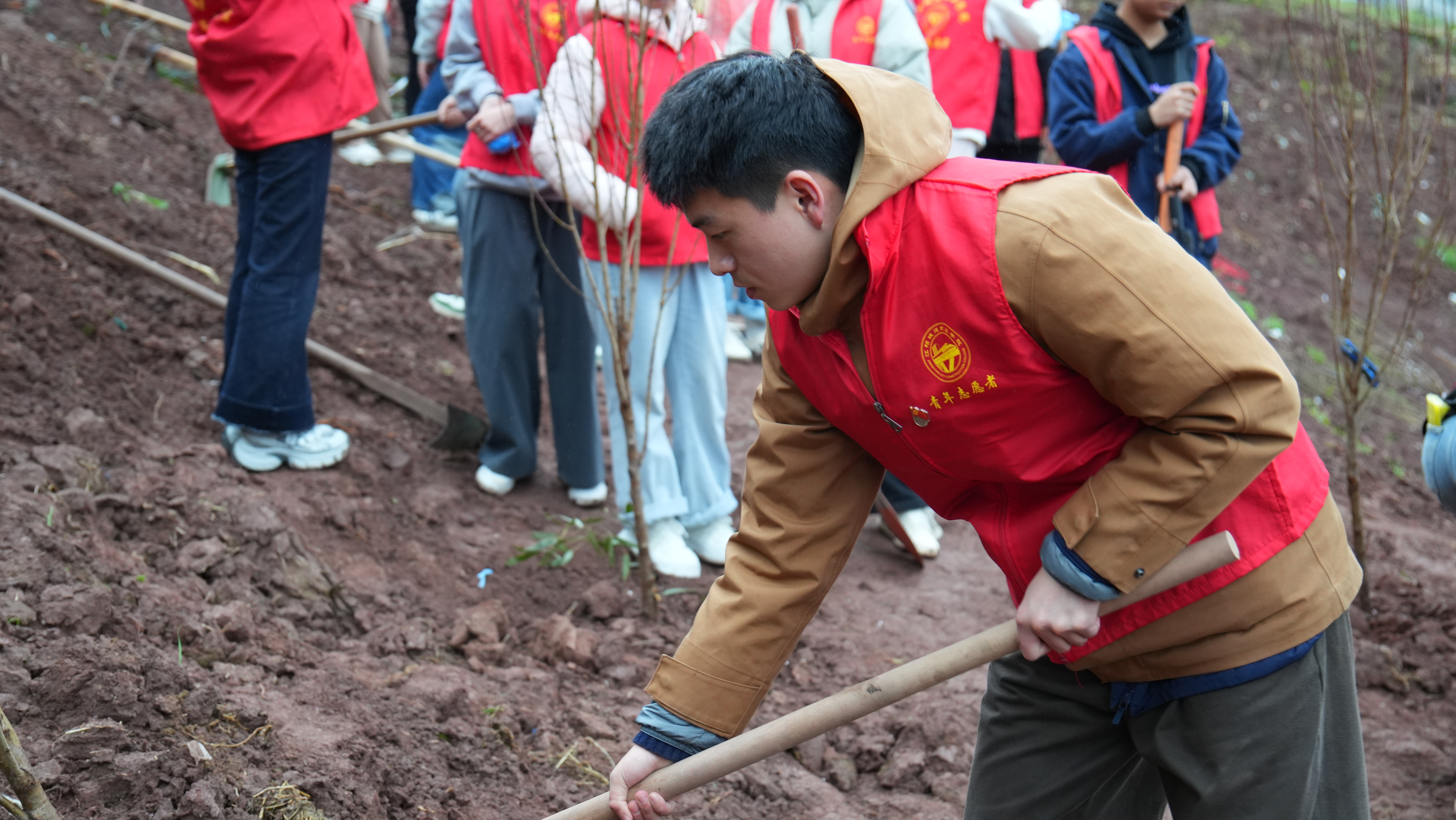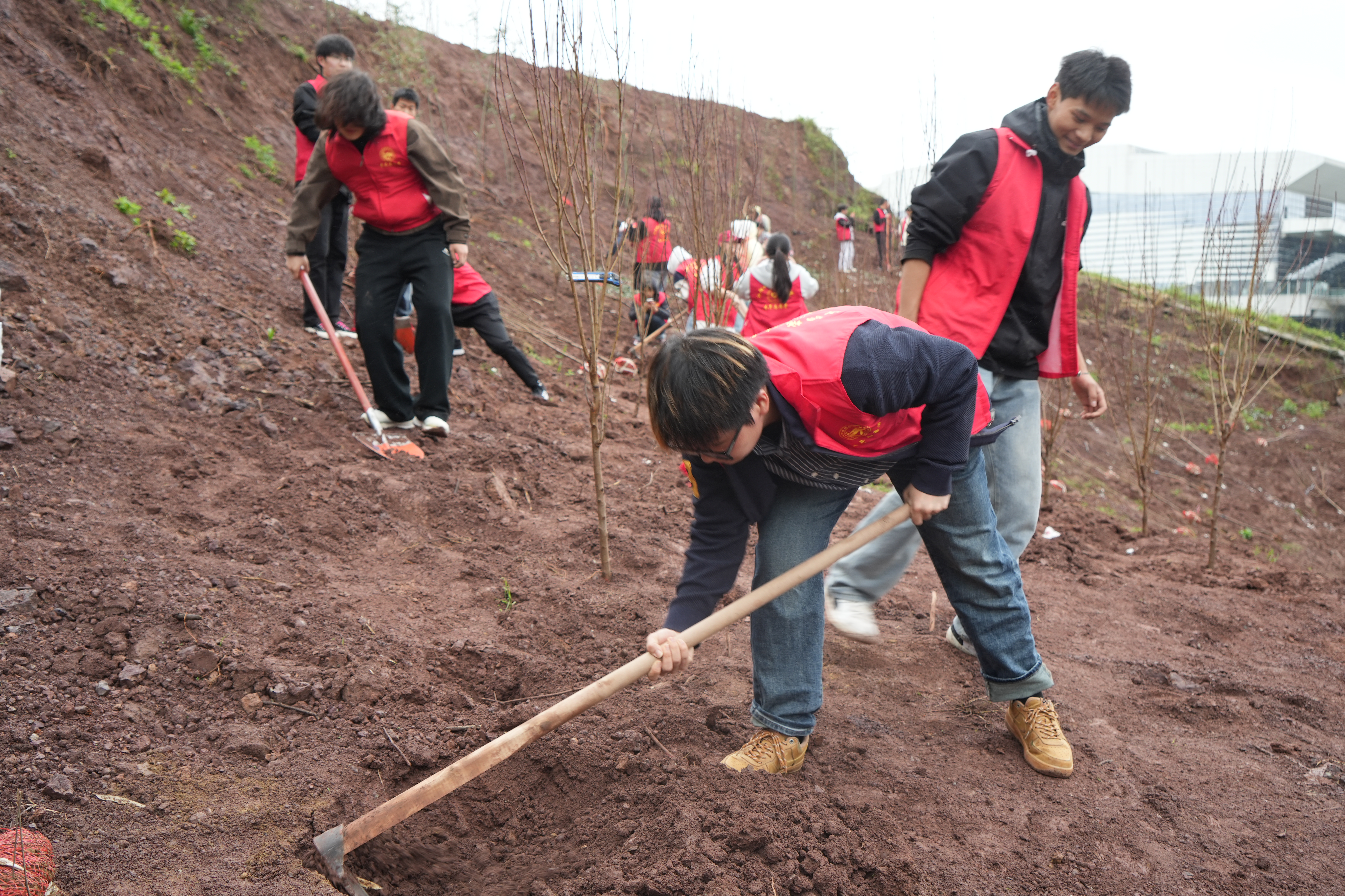 同学们紧随其后,主动扛起工具、踊跃参与,以小组为单位分工协作,认真完成挖坑、扶苗、培土、浇水等每一道植树工序。大家不怕脏、不怕累,即便汗水浸湿衣衫,也始终保持着积极昂扬的状态,相互鼓励、彼此配合,高效推进植树任务。随着一棵棵树苗迎风挺立,泸州市高铁站周边增添了片片新绿,也凝聚着师生们的劳动与心意。在协作劳动中,同学们真切体会到植树护绿的艰辛与快乐,更深刻领悟到植树节的生态意义,充分展现我校学子吃苦耐劳、乐于奉献、勇于担当的青春风采。