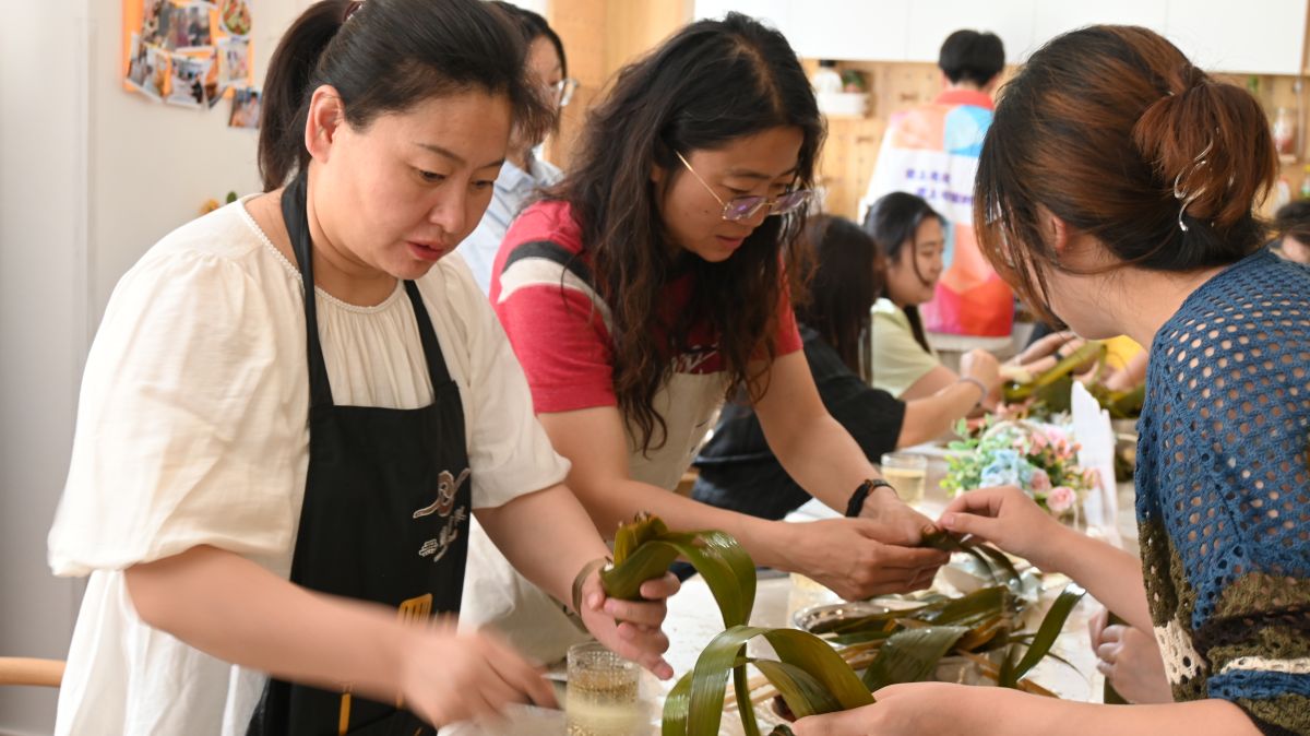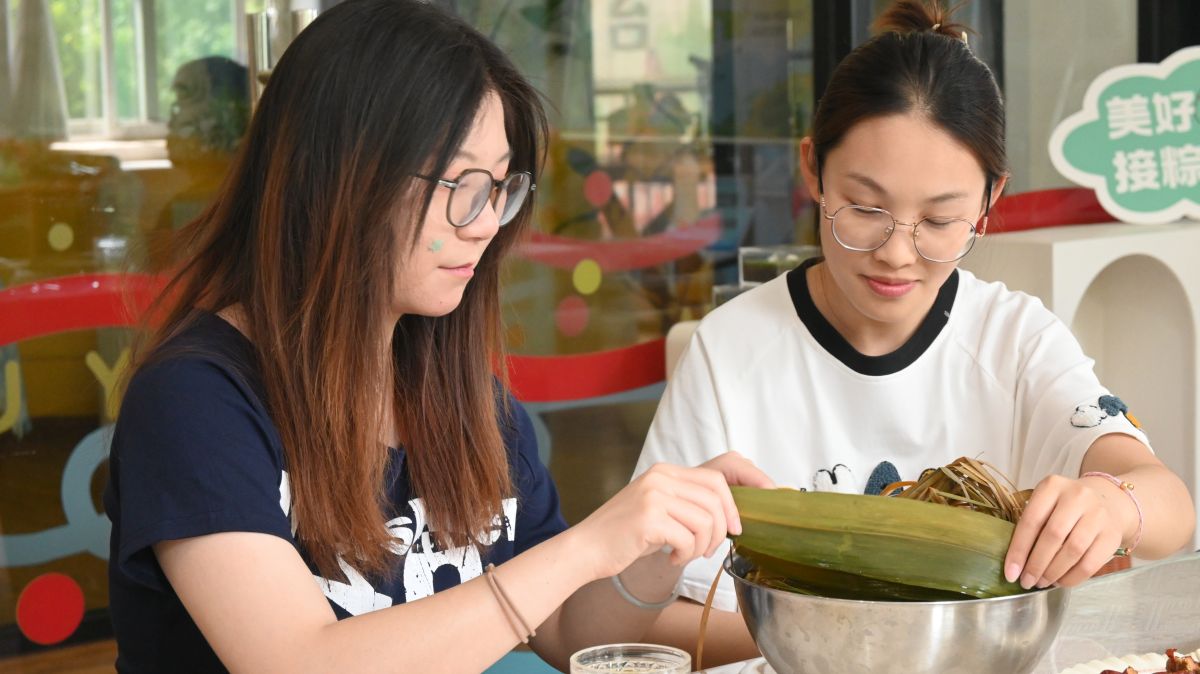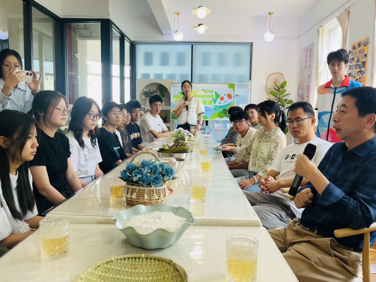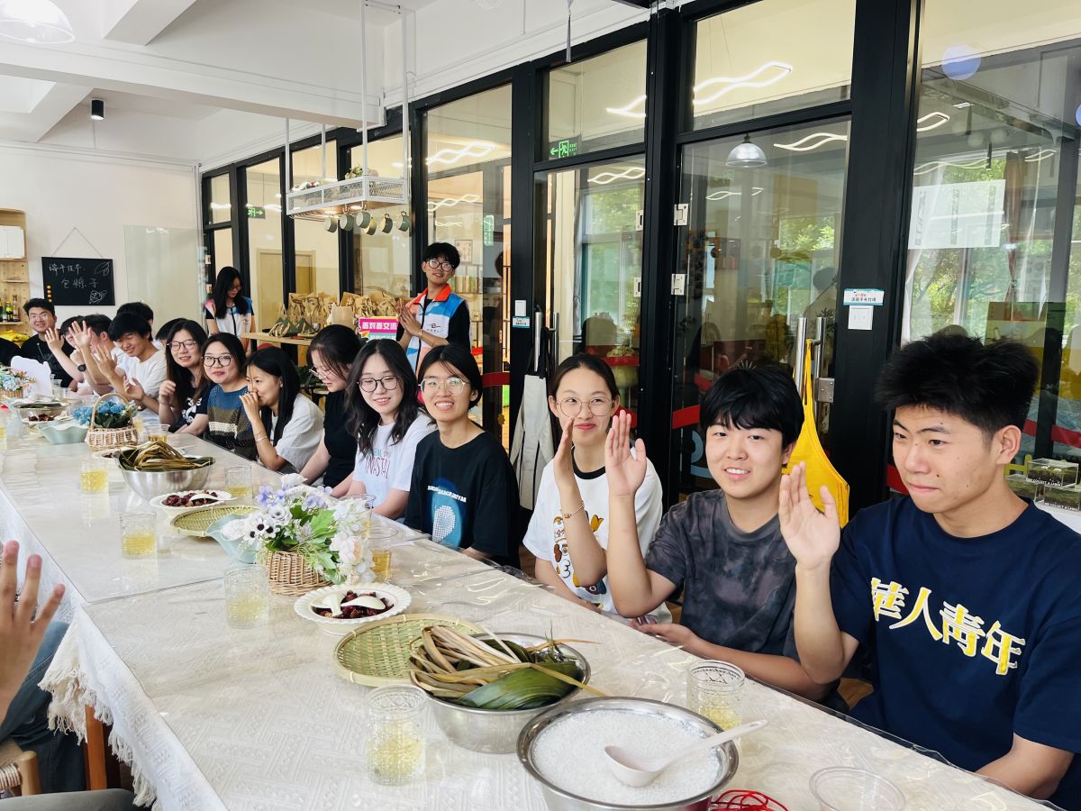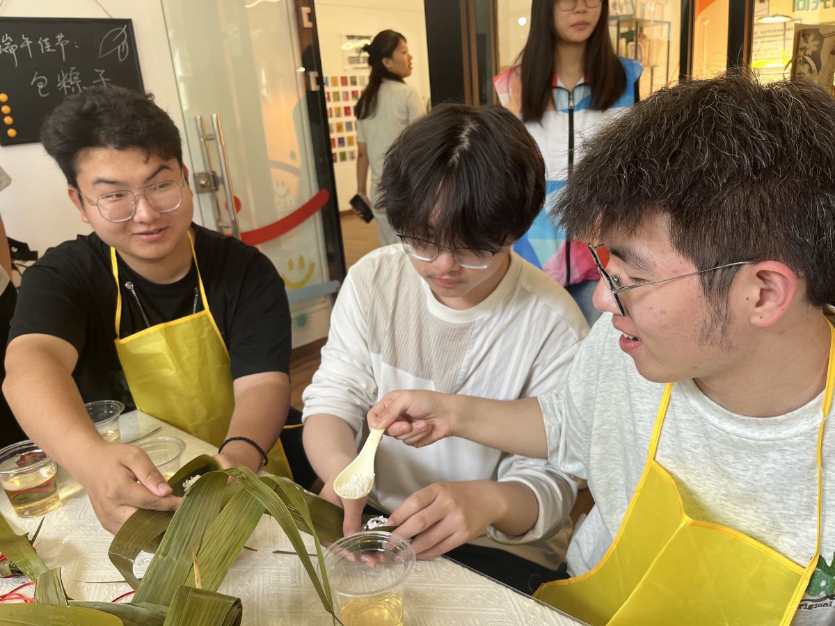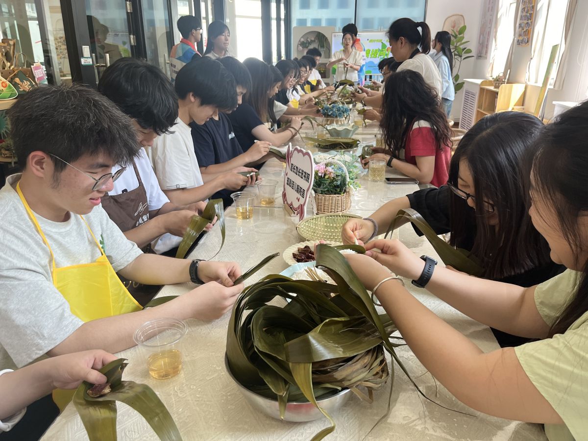 端午时节,粽香四溢。热烈的问答环节结束后,活动现场摇身一变,化作充满传统韵味的“美食工坊”。师生们纷纷化身“厨房能手”,在传统习俗与创意灵感的交织中,开启了一场别开生面的体验之旅。长桌上,翠绿的粽叶、晶莹的糯米、甜蜜的红枣依次铺展,箬叶的清香在空气中悄然弥漫。师生围坐,折粽叶、填糯米、捆粽绳…… 虽然动作略显生疏,但欢声笑语却始终萦绕在房间每个角落。
