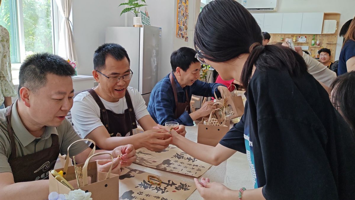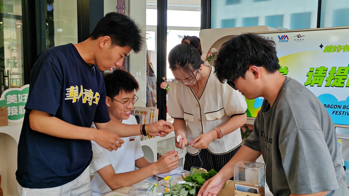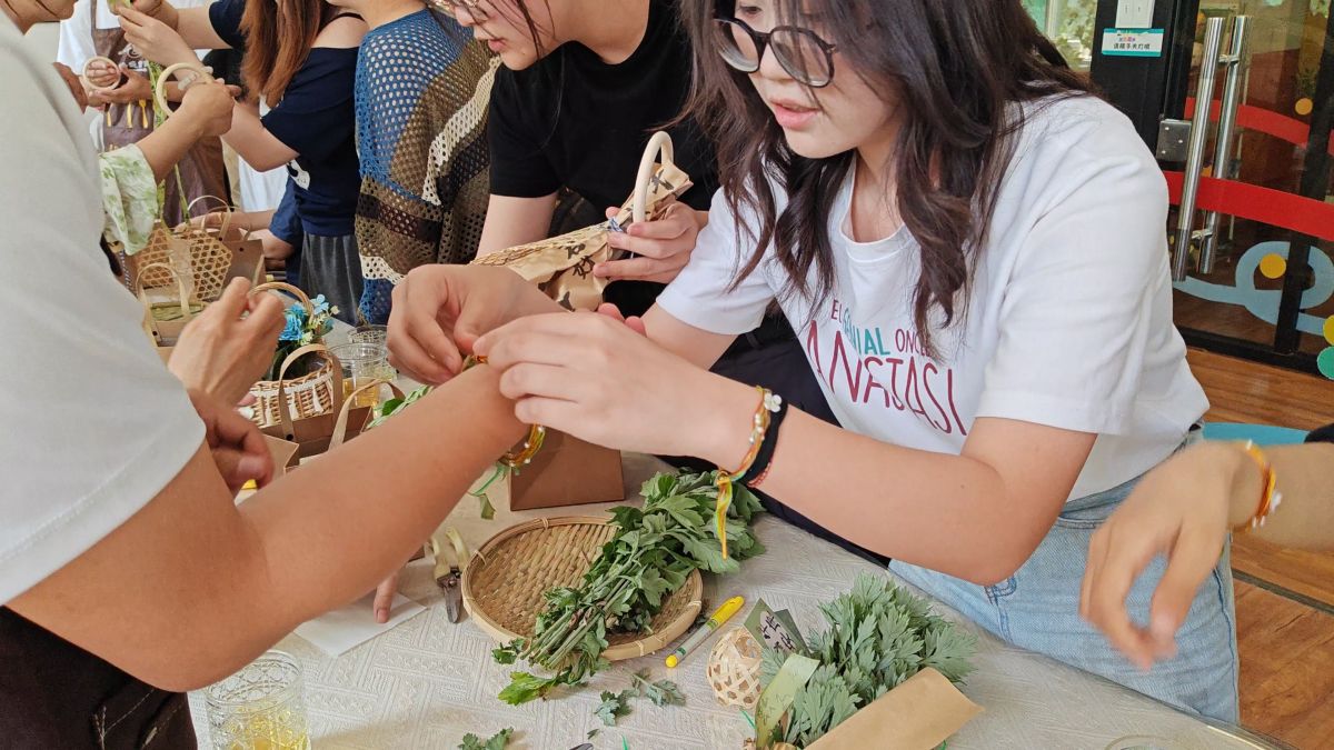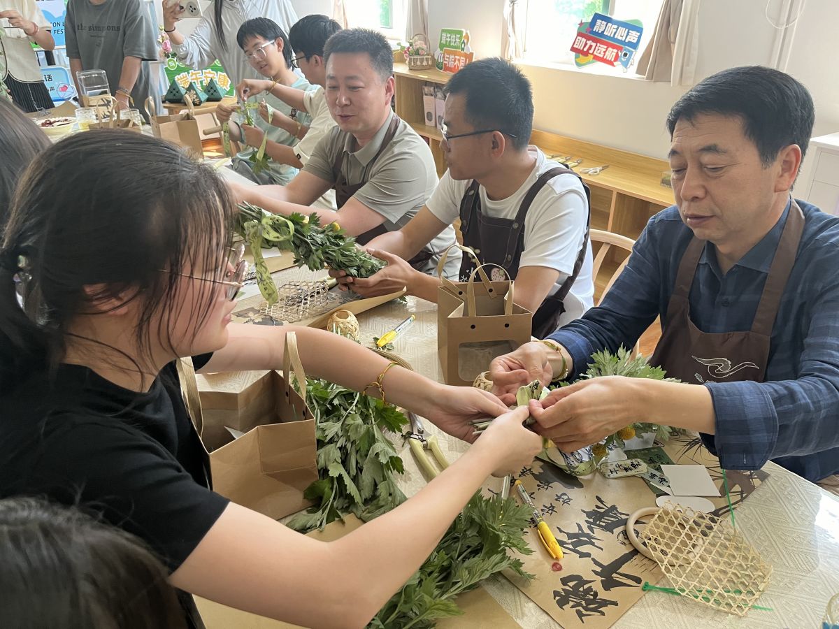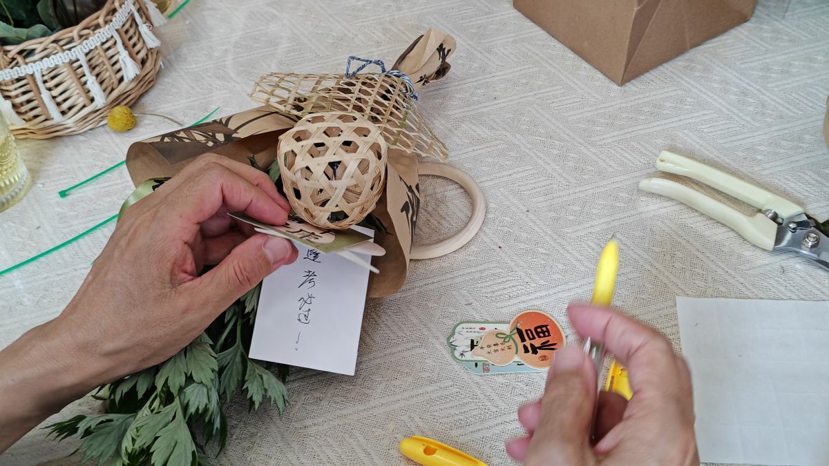 以艾传情,以香载福。桌面上长短交错的艾草散发着幽幽清香。无边书院社区综合办主任任爱玲老师适时讲解:“挑选艾草有个传统讲究,要取单不取双,这才符合端午‘扶阳抑阴’的节气特点,而且艾草一定要‘挂倒不挂正’,谐音‘到家’,寓意福气临门,可驱赶邪气。”雷老师随即拿起艾草进行示范,师生们认真聆听后开始精心制作。最后,师生们郑重写下心愿卡,并用铃铛、彩带等配件装饰花束,将美好期许珍藏其中。