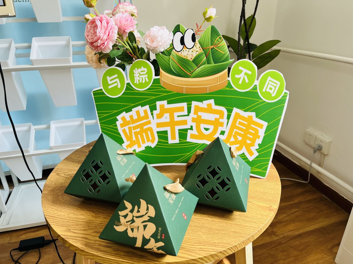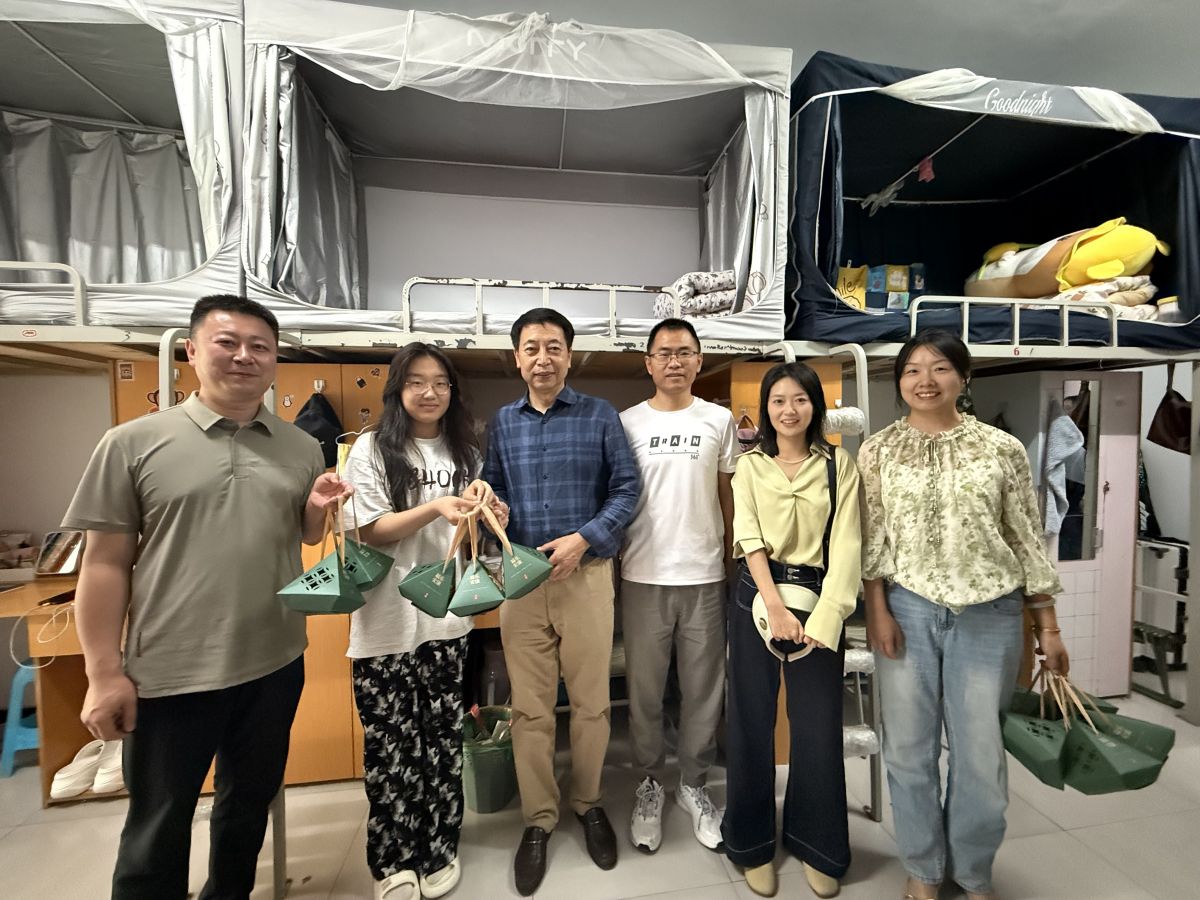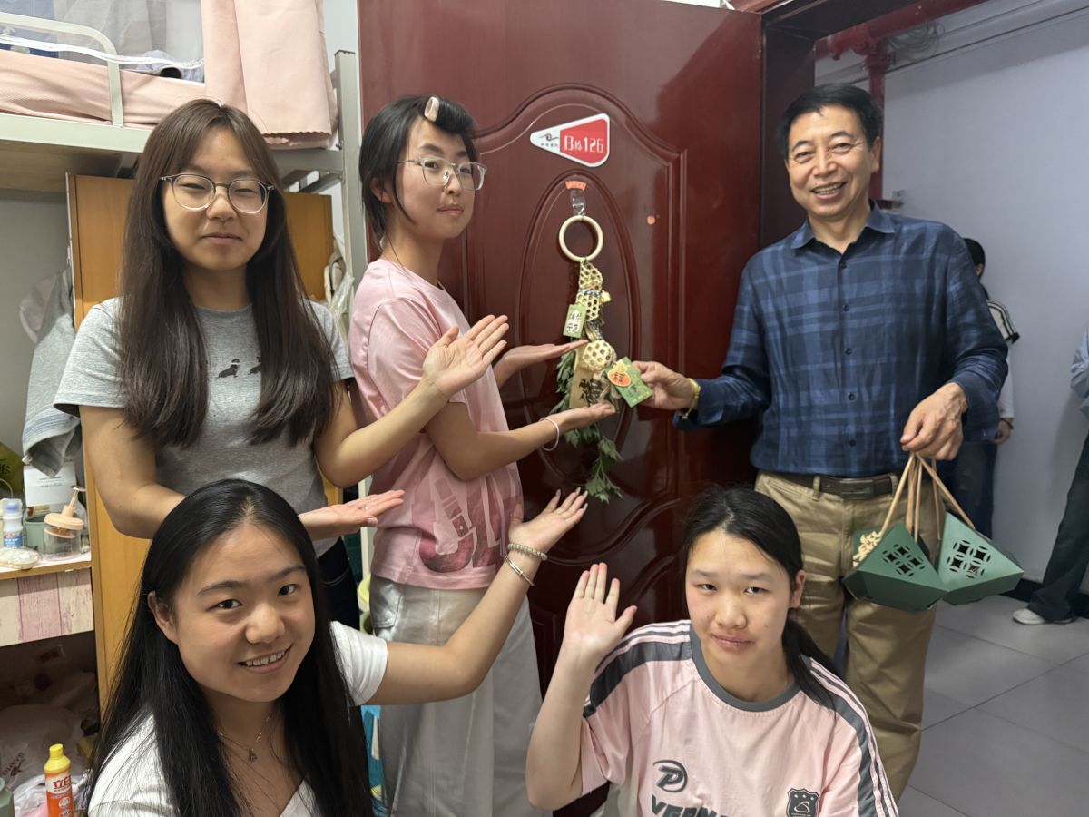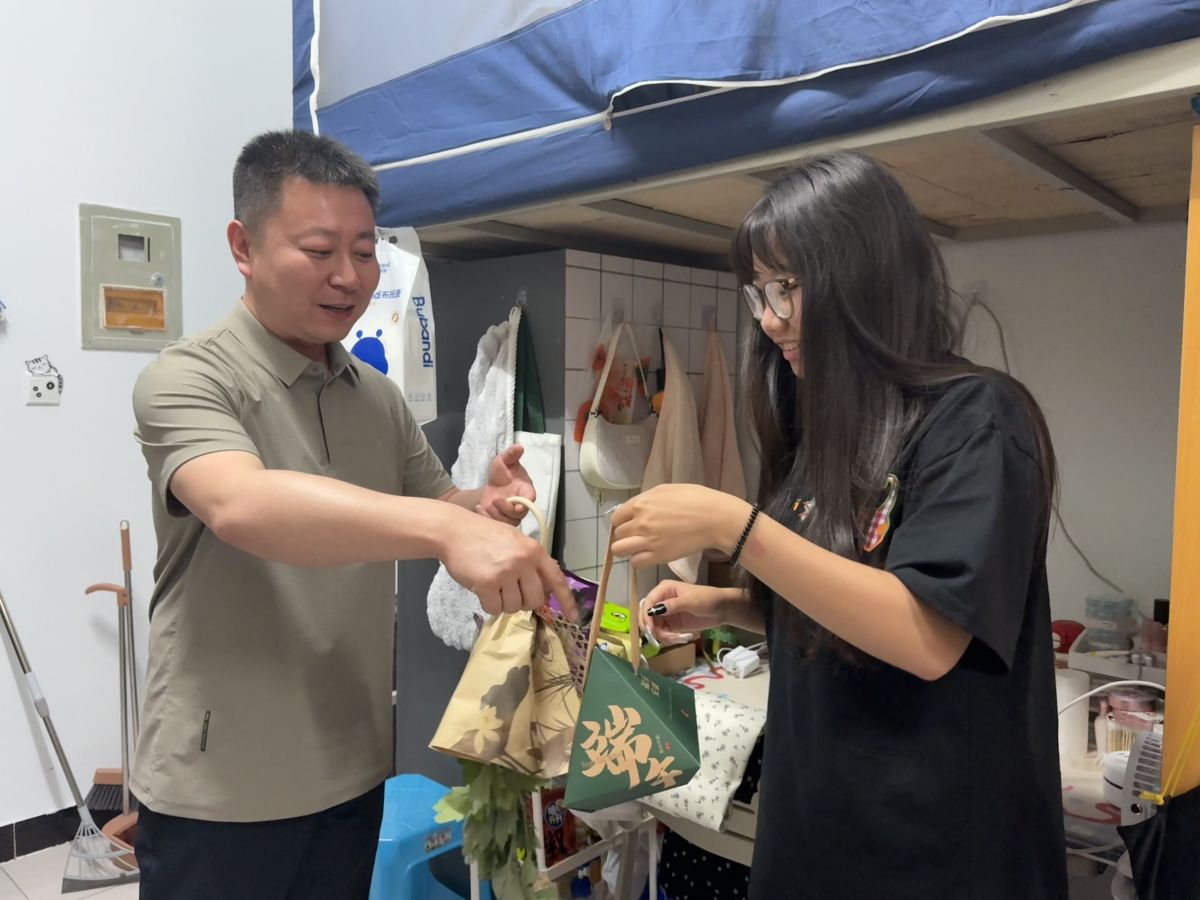 校院领导与老师们手持精心编织、缀满铃铛的竹编花束,捧着刚出锅还冒着热气的粽子,走进无边书院社区B栋宿舍楼。每到一间宿舍门前,傅校长便亲手将艾草花束悬挂于门楣之上,寓意着“驱邪纳吉,温暖常伴”,为学子们送去最真挚的节日祝福。来自无边B栋124宿舍的任倩飞同学开心地分享:“没想到能收到来自校领导亲手制作花束,真的太意外啦,这让在异地上学的我感受到了家的温暖。”随后,老师们又将热气腾腾的粽子一一递到同学们手中,并给予“端午安康,学业有成,未来可期”的祝福。