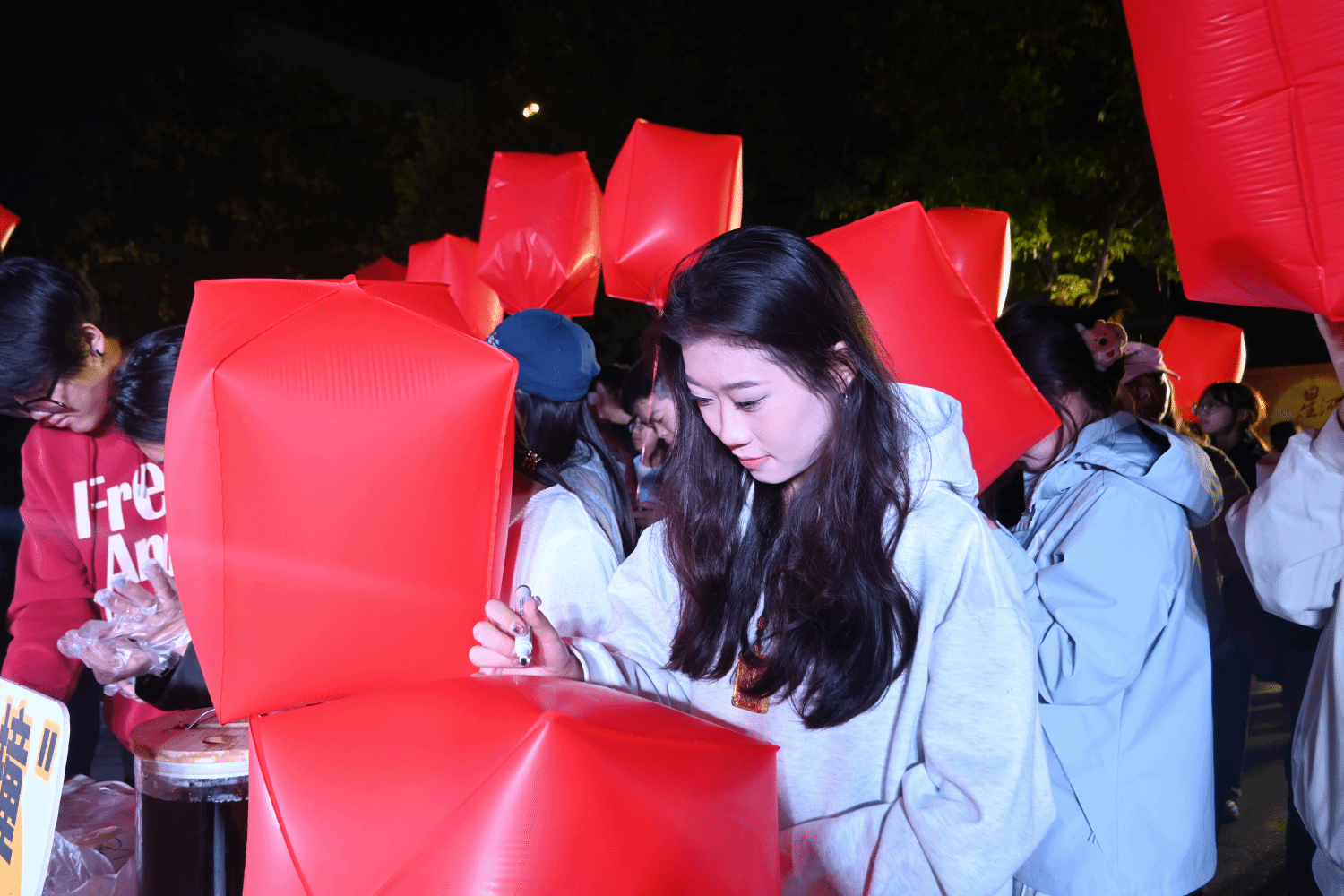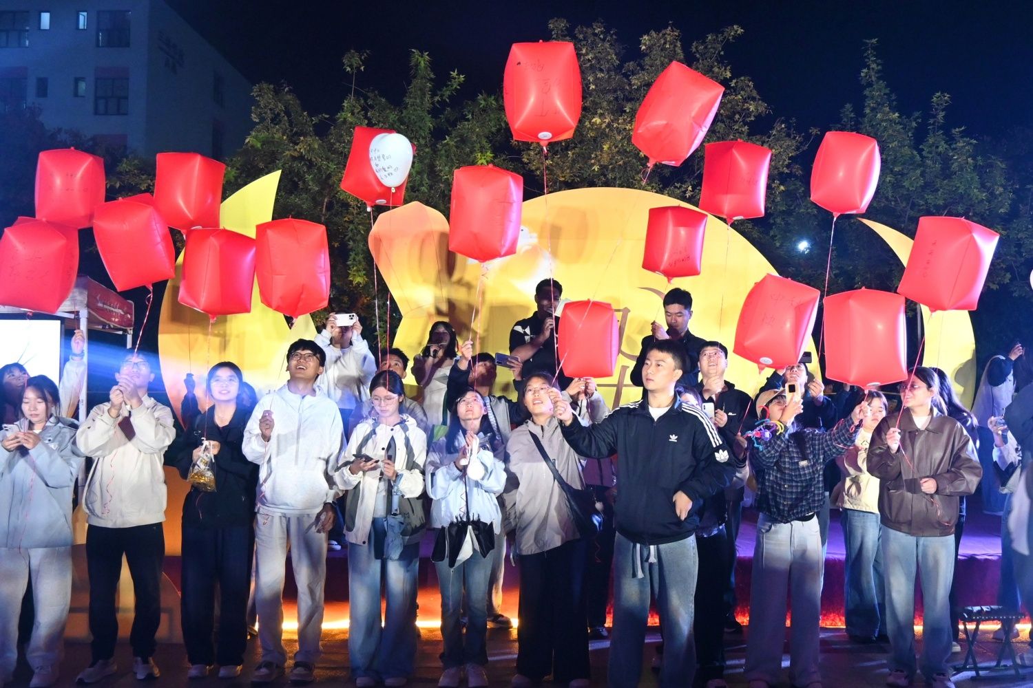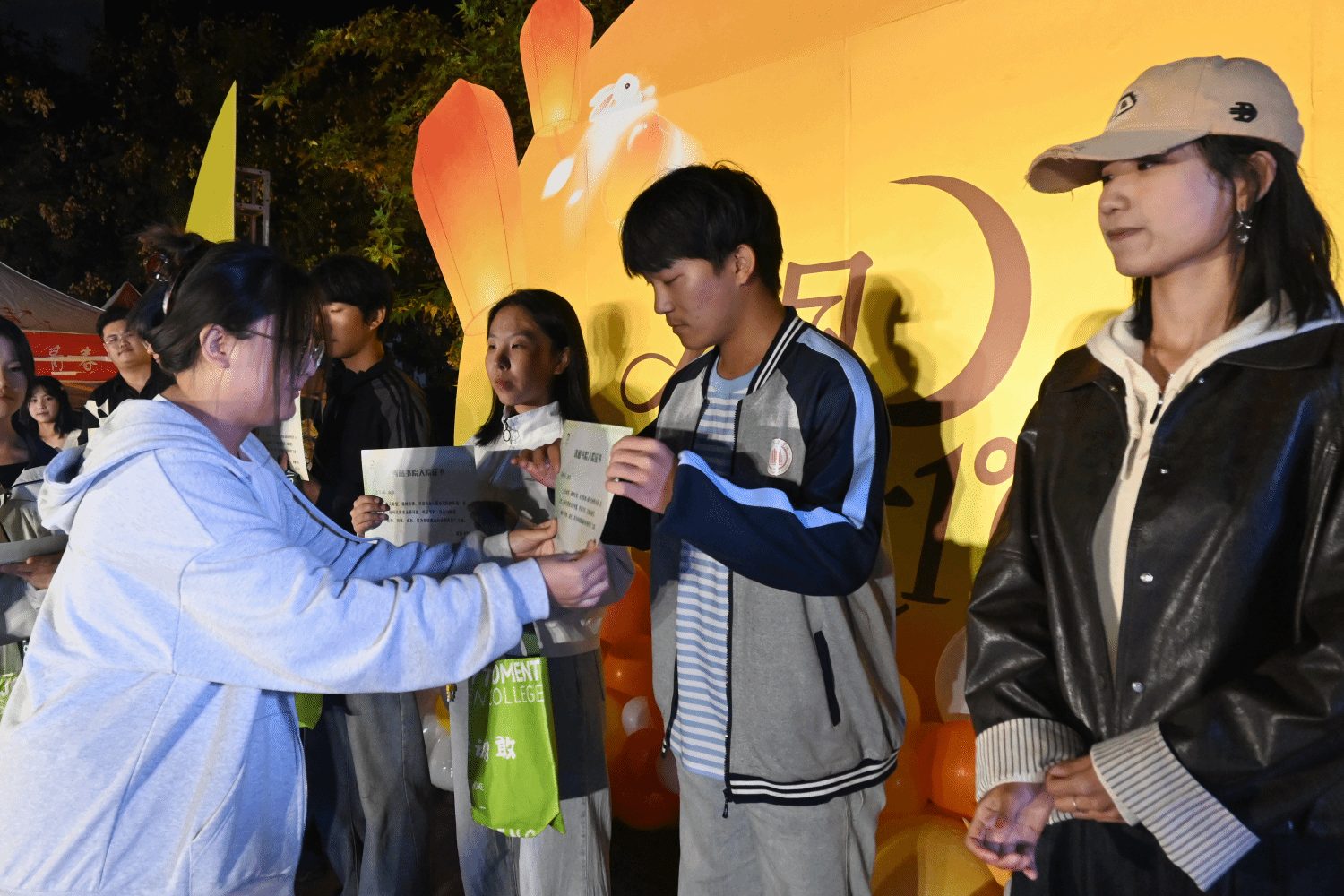 活动融入了温馨的新生入院礼环节。青藤书院新生代表乔炳宇分享了对书院生活的期待,赤诚话语里满是对校园的向往,为“月亮”注入新生的朝气;书院发展导师杨佳琦为新生颁发入院证书和伴手礼,象征着新生正式融入书院大家庭,增强了新生对书院的归属感。最动人的时刻当属“1℃甜‘园’”环节。书院教师杨美斌为大家送上祝福:“愿这一点甜、这一份圆,汇聚成书院大家庭永久的温暖与团圆;也希望大家在阿信,能够爱你所爱。”话音落下,他与师生代表共同切开了象征团圆寓意的巨型月饼,将现场气氛推向温馨的高潮。随后,全场师生在孔明灯氦气球上书写心愿,同步放飞。漫天心愿升空的场景,映照着张张笑脸,成为这个中秋最温暖的记忆。