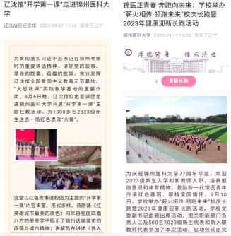 赓续红色血脉,充分利用锦州本地红色资源及学校红医校史,通过开展“辽沈战役纪念馆红色故事进校园”校园宣讲、“薪火相传·领跑未来”校庆长跑暨2023年健康迎新长跑、常态化升国旗教育等活动进行爱国主义教育,落实“红色育人”工程,筑牢家国情怀,帮助新生扣好大学生活第一粒扣子。