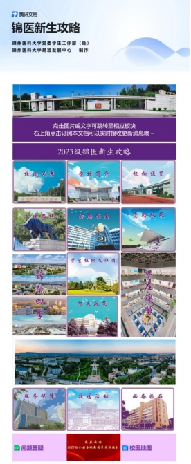 为更好地服务师生,帮助同学更好更快地熟悉锦医校园,适应大学生活,学校整合资源,依托腾讯文档程序,在省内高校首创制作2023级锦医新生的攻略站,内容涵盖锦医概况、网址导航、入学指南、校园风景、校园活动、政策规定、学生组织及社团以及新生答疑等8大板块多项内容。从入学相关事项到校园学习生活必备信息应有尽有,依托“智慧迎新”系统,通过可视化大数据平台掌握实时报道数据,打造智慧迎新新模式。