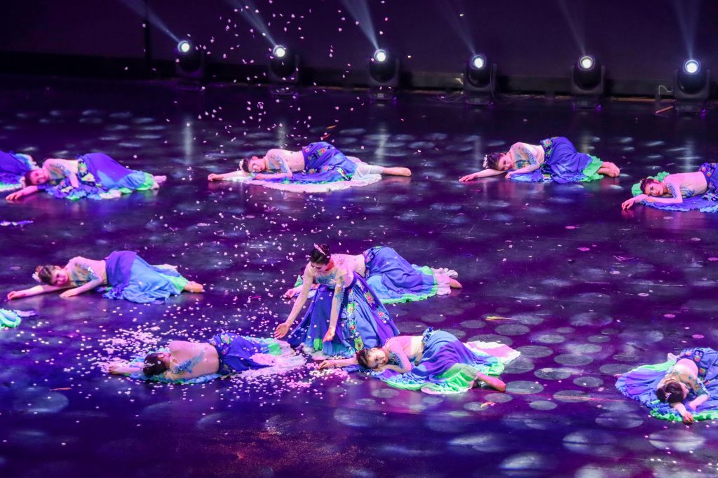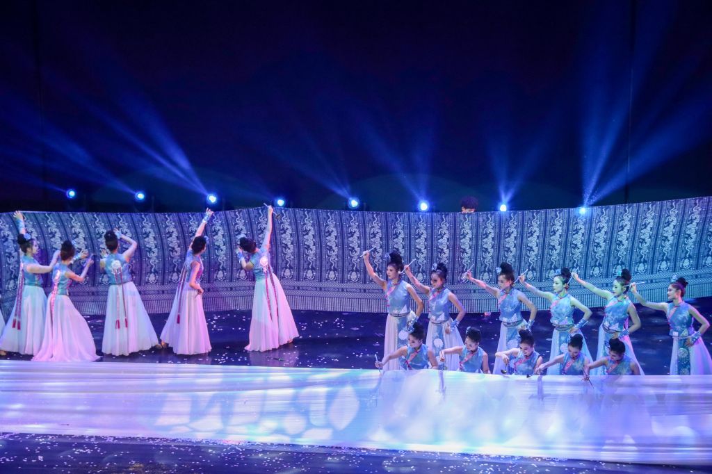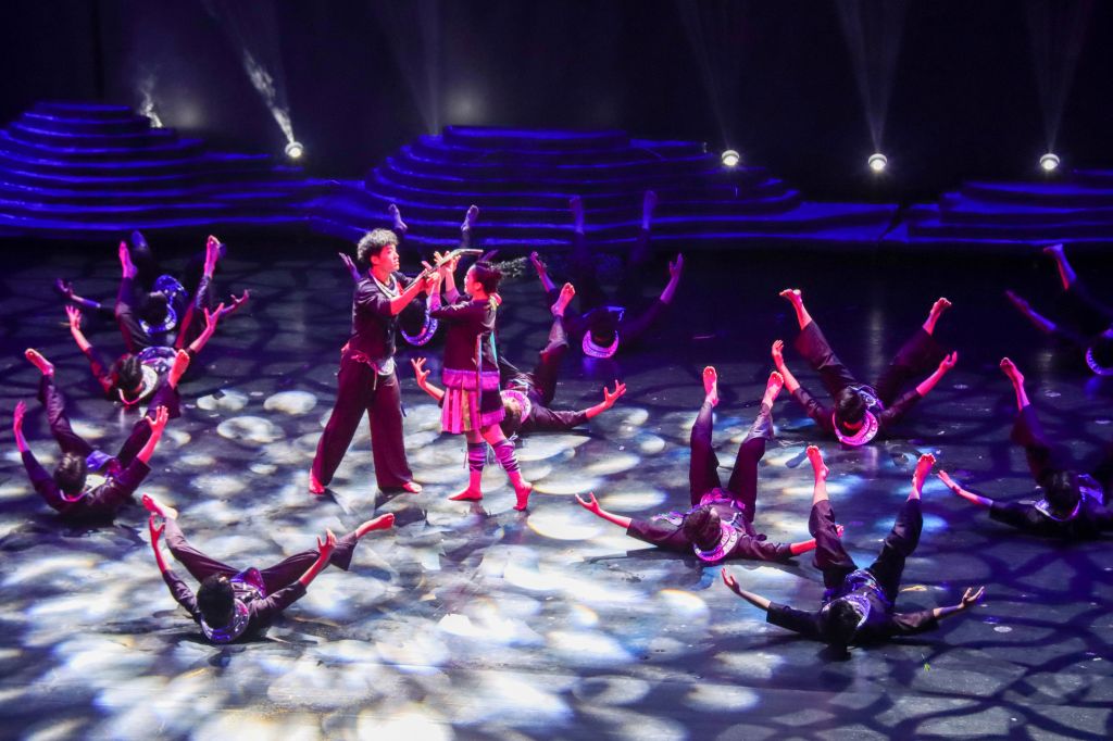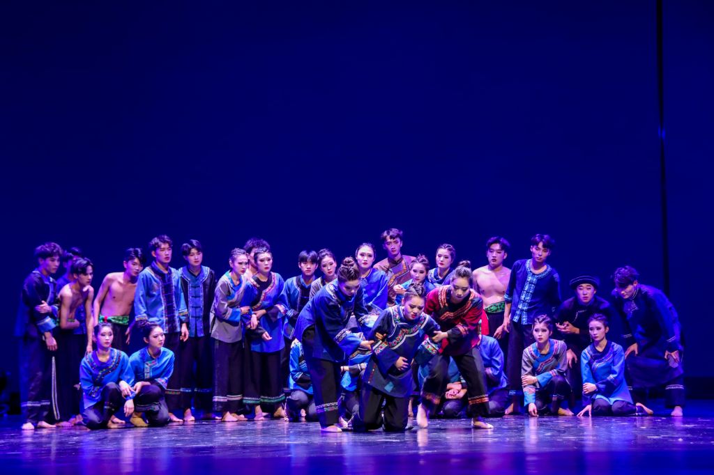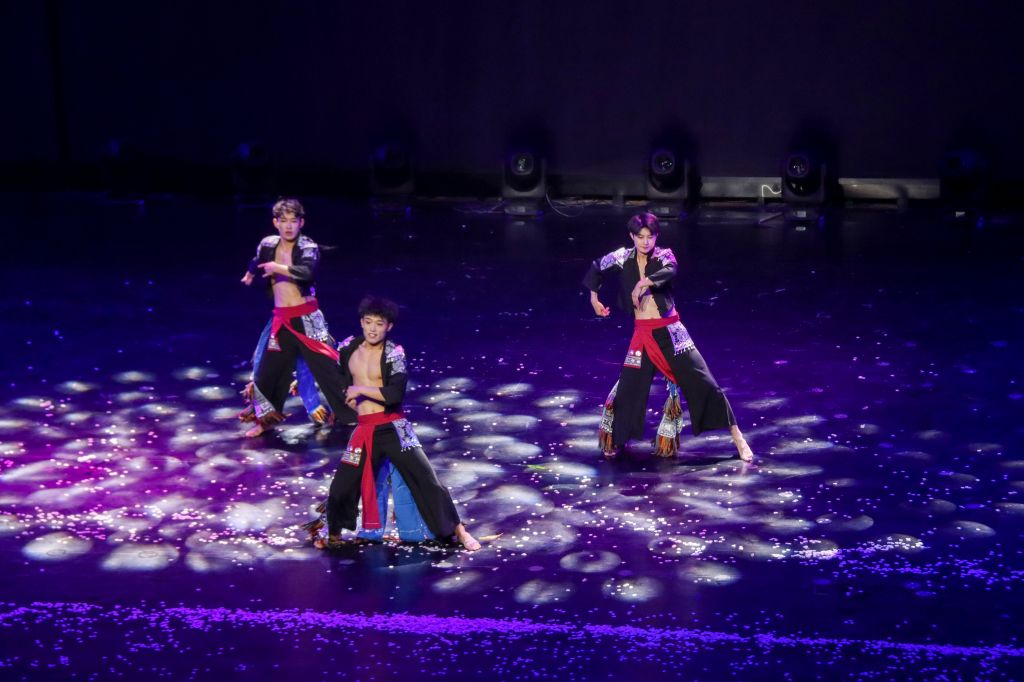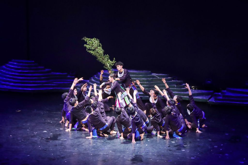 第二篇章《涅槃重生》在多彩的灯光中呈现,毕业生们以优美的舞姿、华丽的服饰和富有韵律的音乐,展现着苗族儿女挣脱往昔束缚,在肥沃的土地上绽放出绚丽生命之花的场景。