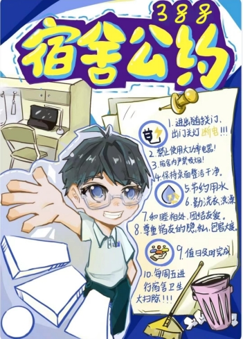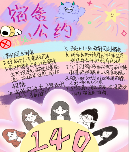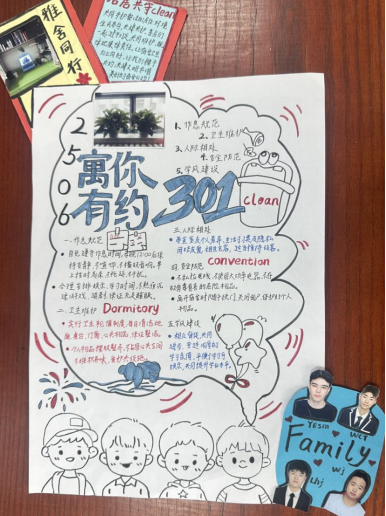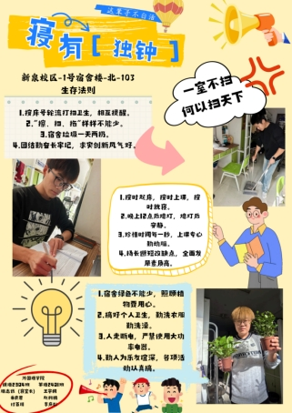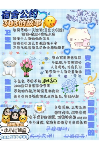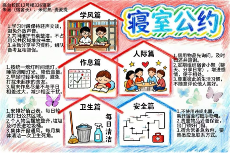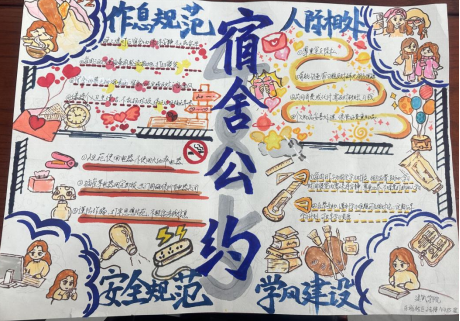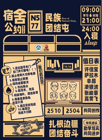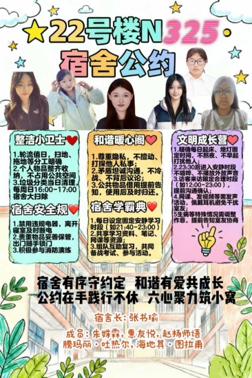 为深入推进学生宿舍文明建设,提升学生的自我管理与协作能力,“一站式”学生社区于近期组织开展了宿舍公约大赛。本次大赛旨在引导各宿舍围绕作息规范、卫生维护、人际相处、安全防范、学风建设等多方面内容,结合自身特色,制定具有约束力与认同感的宿舍公约。参赛作品以创意海报为载体,融合视觉设计与文字规范,充分体现了各宿舍的文化理念与集体智慧。现将获奖作品集中展出如下: