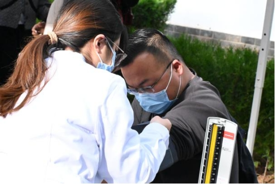 义诊活动现场,医学院党总支和教研室老师、学生志愿者以及园区工作人员早早到达现场,做好各项准备工作。活动现场秩序井然,参与体检的宿管阿姨、保安和后勤人员在工作人员的引导下,依次进行各项体检项目。