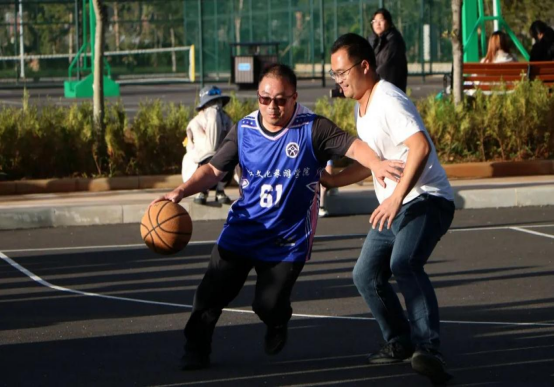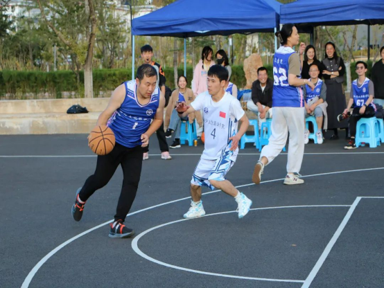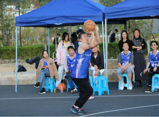 在教工组的比赛中,身着拦色队服的文学院教工联队迎战学生处联队。篮球落下时文学院老师们立即进入激烈的角逐!在赛场上教师们奋力拼搏,互相配合,巧妙传球,精准投篮,与对手共同挥洒汗水,更加发扬出他们不畏困难、勇往直前的精神。