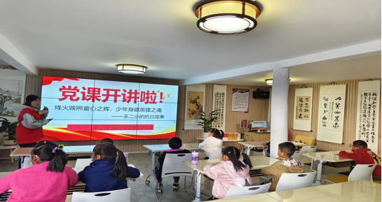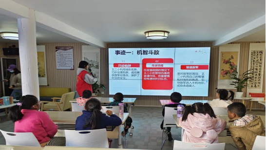 活动开场,党员同志们充分发挥创新精神,采用播放英雄事迹纪念歌曲、纪念短片的新颖授课方式,为小朋友们生动讲述了王二小的英勇事迹。讲述过程中,党员同志们声情并茂,将王二小身上闪耀的爱国主义和英雄主义精神展现得淋漓尽致。这一环节紧密围绕加强红色思政教育展开,用真实感人的故事引导孩子们思考人生价值,树立正确的世界观。孩子们被王二小的事迹深深打动,纷纷表示要学习英雄智慧勇敢、无私奉献的精神,在幼小的心灵中播下了正确价值观的种子。本故事凝练形成社区特色文化,调动党建、校史、专业等多方资源,沉淀形成符合学校、社区特点的文化氛围。