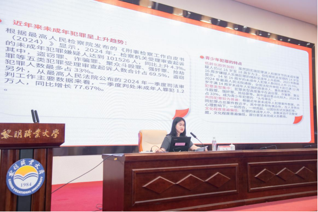 启动仪式后,黎明职业大学首批校外普法讲师,泉州市中级人民法院民事审判第四庭副庭长、一级法官林艳以《职彩人生 法治护航》为主题,为师生带来一堂生动的普法课。讲座围绕青少年犯罪预防核心议题,通过“案例+法理+互动”形式,系统解析法律知识,强化学生自我防护能力。