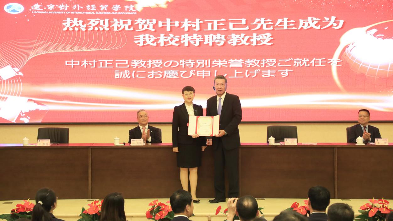 校长吕红军为中村正己会长颁发聘书,聘任他为我校特聘教授。