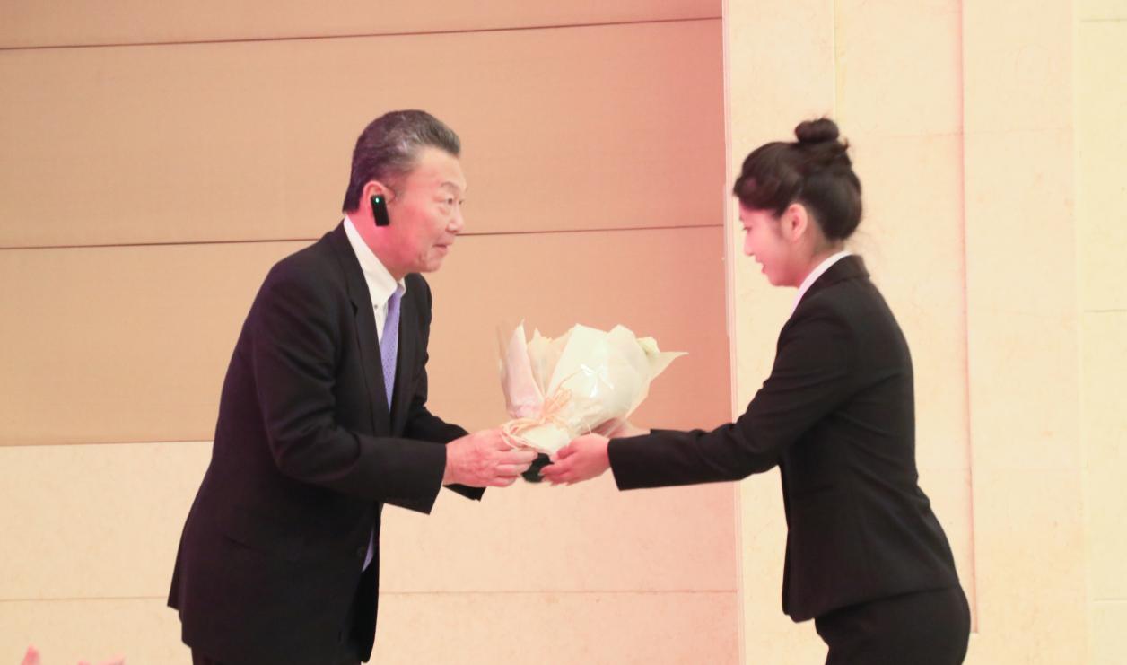 学生代表向中村正己教授献花。