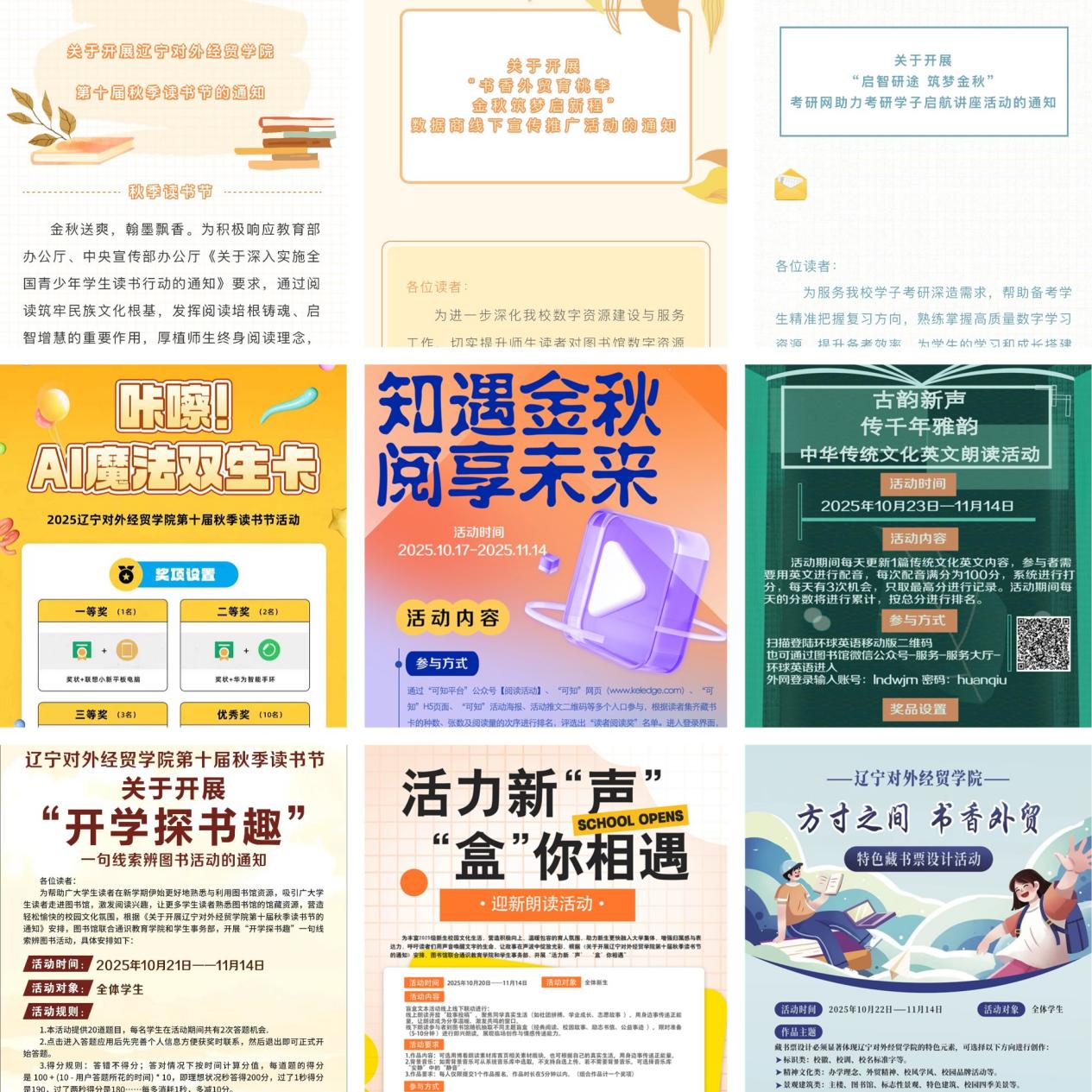 多元活动矩阵,构筑立体阅读体验。本届读书节创新推出“方寸之间·书香外贸”藏书票设计大赛,鼓励师生以艺术笔触描绘校园印记;“知遇金秋·阅享未来”可知数字阅读活动通过当今年轻人喜爱的盲盒集卡激励模式,引导读者深度探索电子资源;“咔嚓!AI魔法双生卡”创意摄影则开创科技与艺术融合新路径,邀请师生用AI技术重构视觉表达;特别设立的“古韵新声·传千年雅韵”英文朗读活动,以跨文化视角重构经典,助力中华优秀传统文化国际传播;而“活力新‘声’·‘盒’你相遇”迎新朗读活动则通过线上线下双轨模式,为新生搭建情感共鸣的声波桥梁。同步开展的“开学探书趣”线索辨书竞赛、起点考研网备考讲座、数据商线下推广等活动,更构建起从资源认知到学术深造的完整支持链。