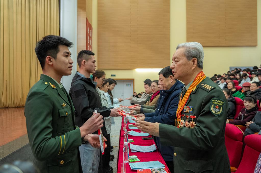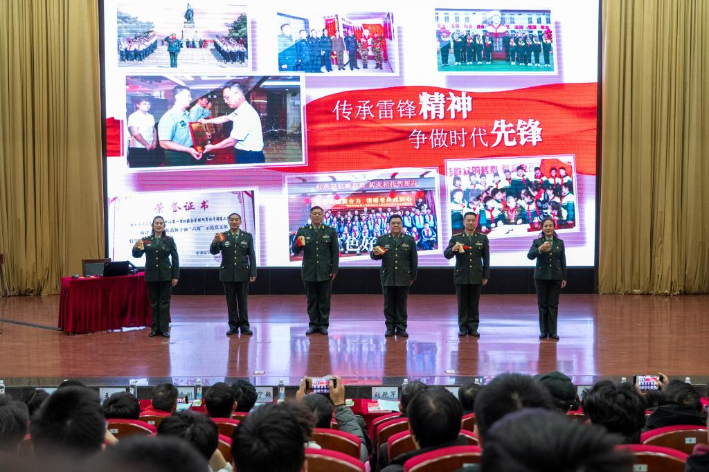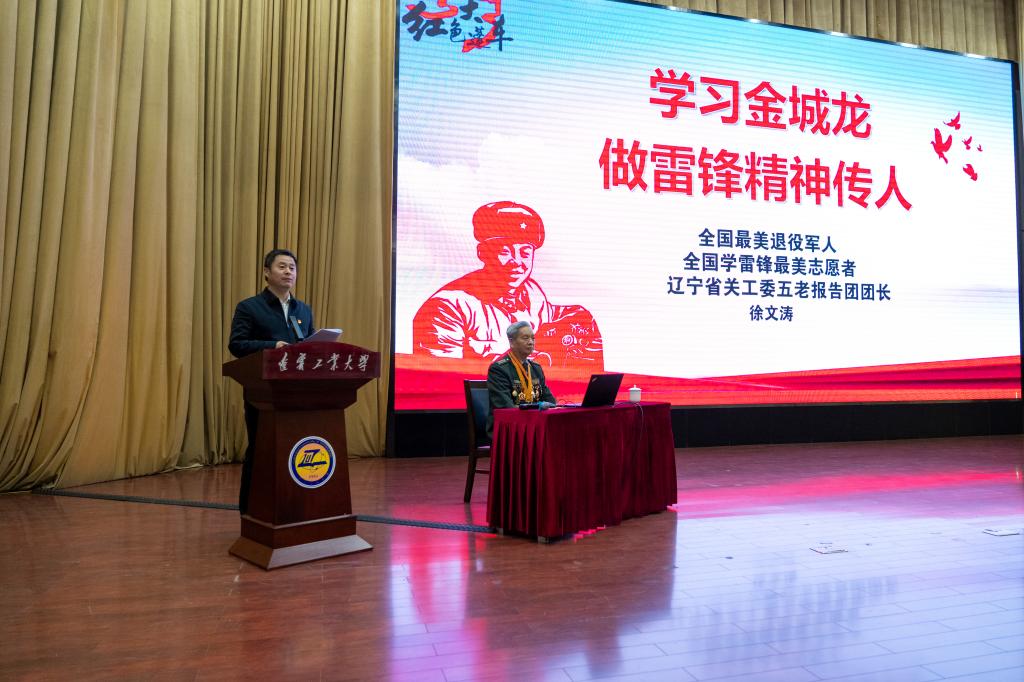 辽宁省道德模范、沈阳军区学雷锋标兵金质荣誉奖章获得者、全国学雷锋最美志愿者徐文涛大校作主题宣讲。他生动解读金城龙同志的先进事迹,分享了自己创建全国全军首个战区级后勤史馆、退休后仍深耕红色宣讲阵地、义务开展红色故事宣讲2000余场次的经历,深刻阐释雷锋精神的时代内涵。整场报告字字铿锵、真挚动人,为师生们带来了一堂入脑入心的思政课。