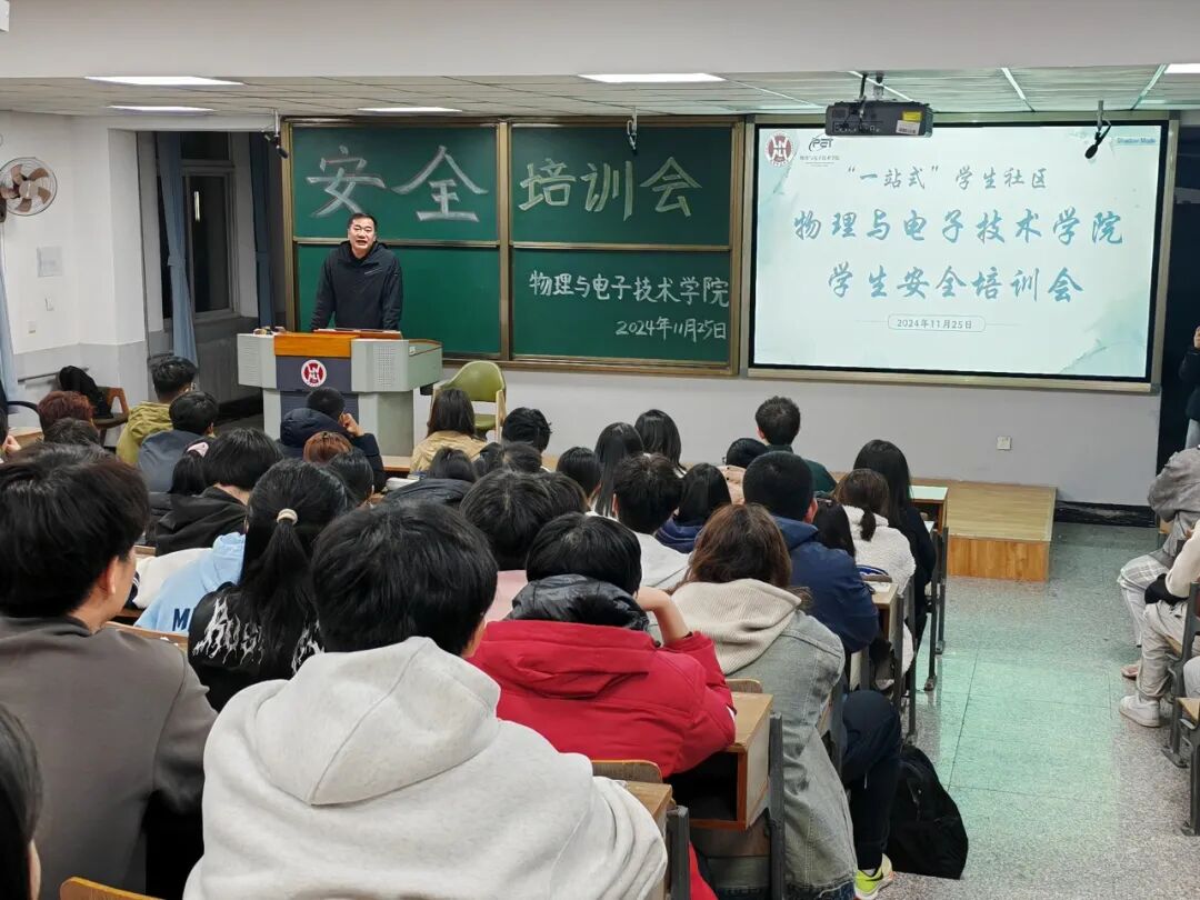 为加强寝室文明建设,增强同学间友好共进氛围,提高学生安全意识,全面促进学生身心健康发展,2024年11月25日17:40,我校于外语楼第二合堂教室召开学生安全培训会。参会人员有张倩老师、任美懿老师、李昭锟老师,以及全体本科生寝室寝室长,权益委员,权益维护部、自律生活部成员。本次会议由雷鸣老师主持。