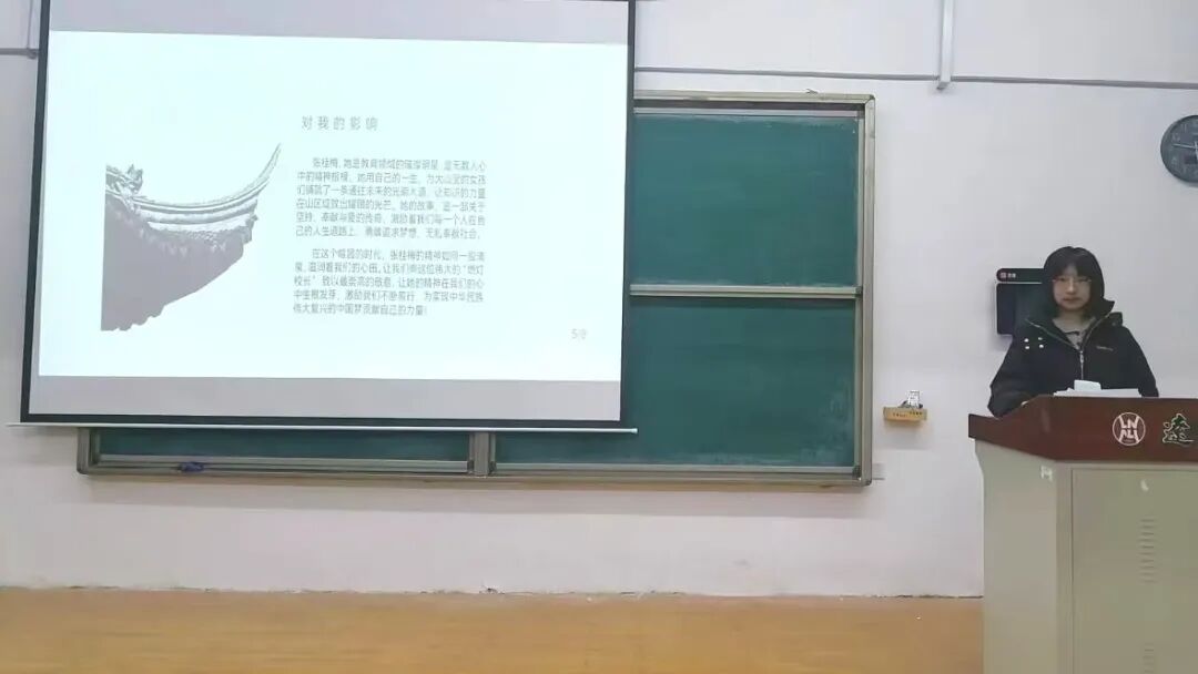 李宇涵同学介绍了张桂梅老师。张桂梅老师以坚强之躯,撑起山区女童教育的希望,用实际行动彰显了教育的力量。对此,她深受鼓舞,决心以张桂梅老师为榜样,将爱与责任融入教学,让教育的春风沐浴更多心灵,践行桃李满天下的教育理念。