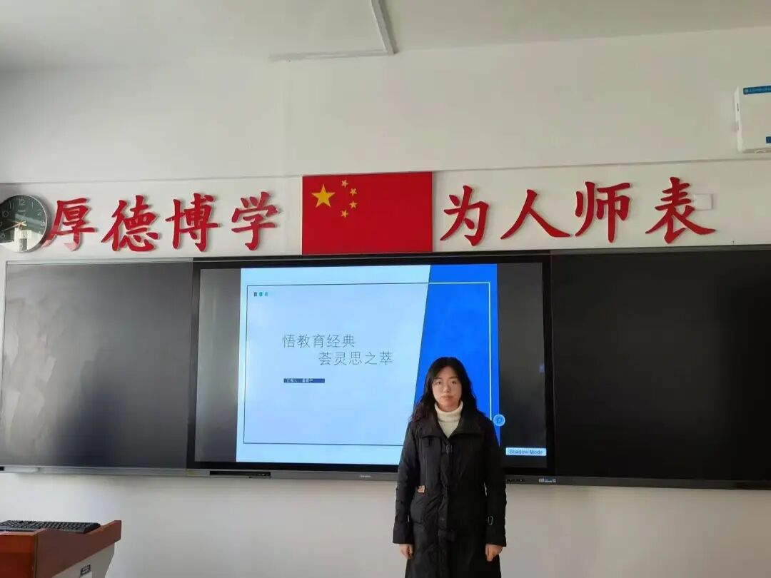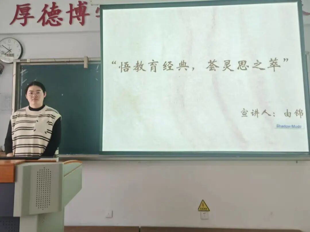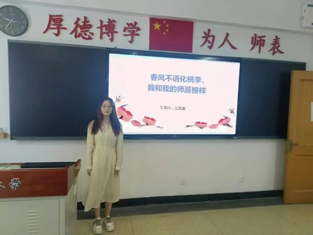 吴婷同学向大家介绍了中国幼教之父——陈鹤琴。她具体介绍了陈鹤琴的“活教育”理念:以“做人、做中国人、做现代中国人”为目标,倡导实践性学习和以大自然、大社会为课堂。该理念深深地影响了她,她认为师范生应以陈鹤琴为楷模,在实践中践行“活教育”理念,让课堂充满生命力,让每个孩子都能在春风化雨中茁壮成长。