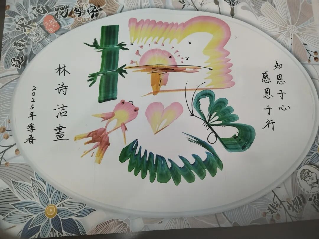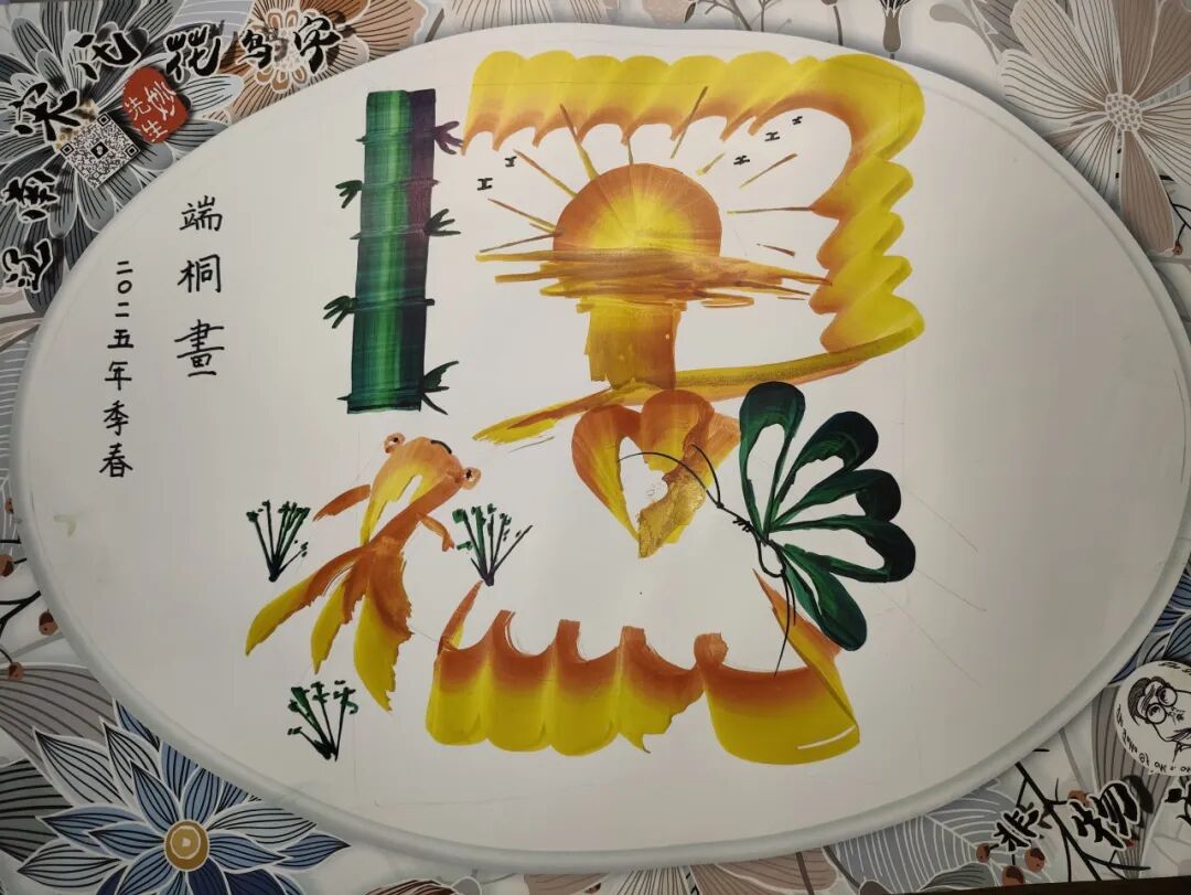 最后,在实践环节,宋明浩老师邀请现场老师及同学们亲身体验七彩龙凤花鸟字。他从握笔姿势、调色技巧到构图要领逐步对同学们进行细致指导,耐心纠正每一个细节错误。活动现场气氛热烈,参与体验的同学们都完成了各具特色的作品,纷纷表示收获颇丰。