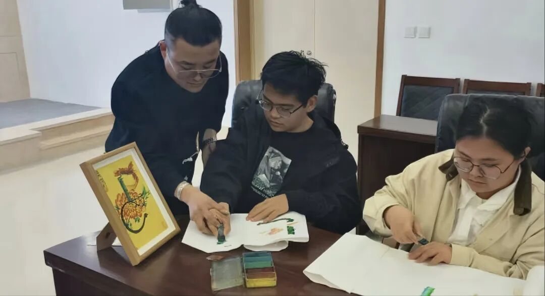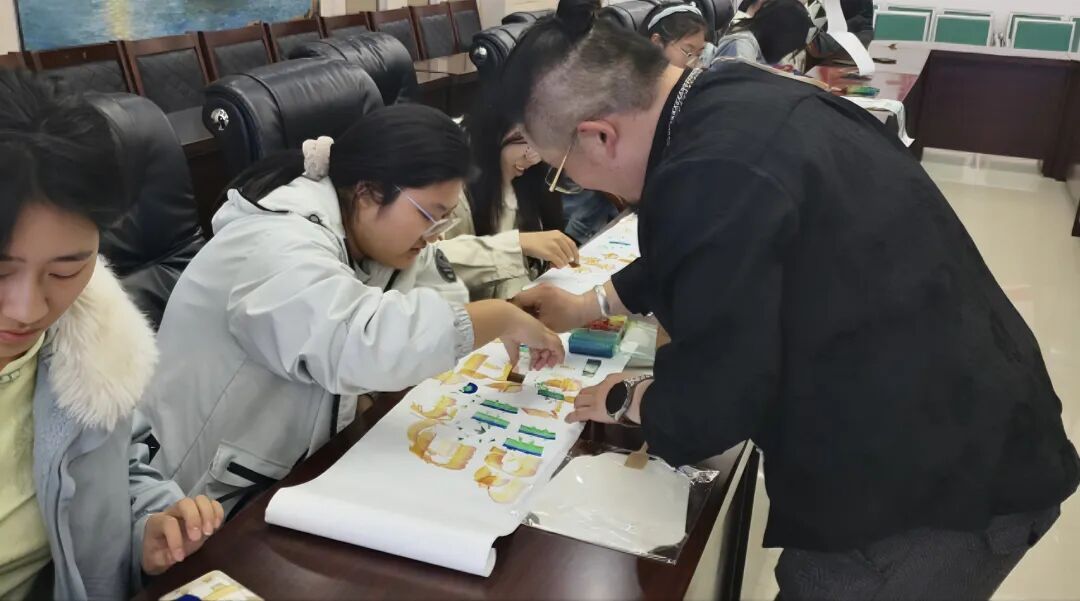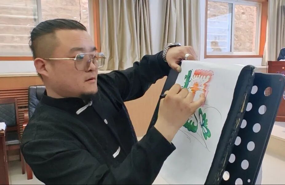 随后,他详细介绍了辽南宋氏七彩龙凤花鸟字的起源、发展以及艺术特色。这种独特的艺术形式融合了龙凤、花鸟等多种元素,通过七彩的渲染,展现出极高的艺术价值和审美意义。在讲解了书写原理、画笔沾色方法以及绘画组合技法后,宋明浩老师还现场展示了七彩龙凤花鸟字的制作过程,让同学们近距离感受到这项非物质文化遗产的魅力。