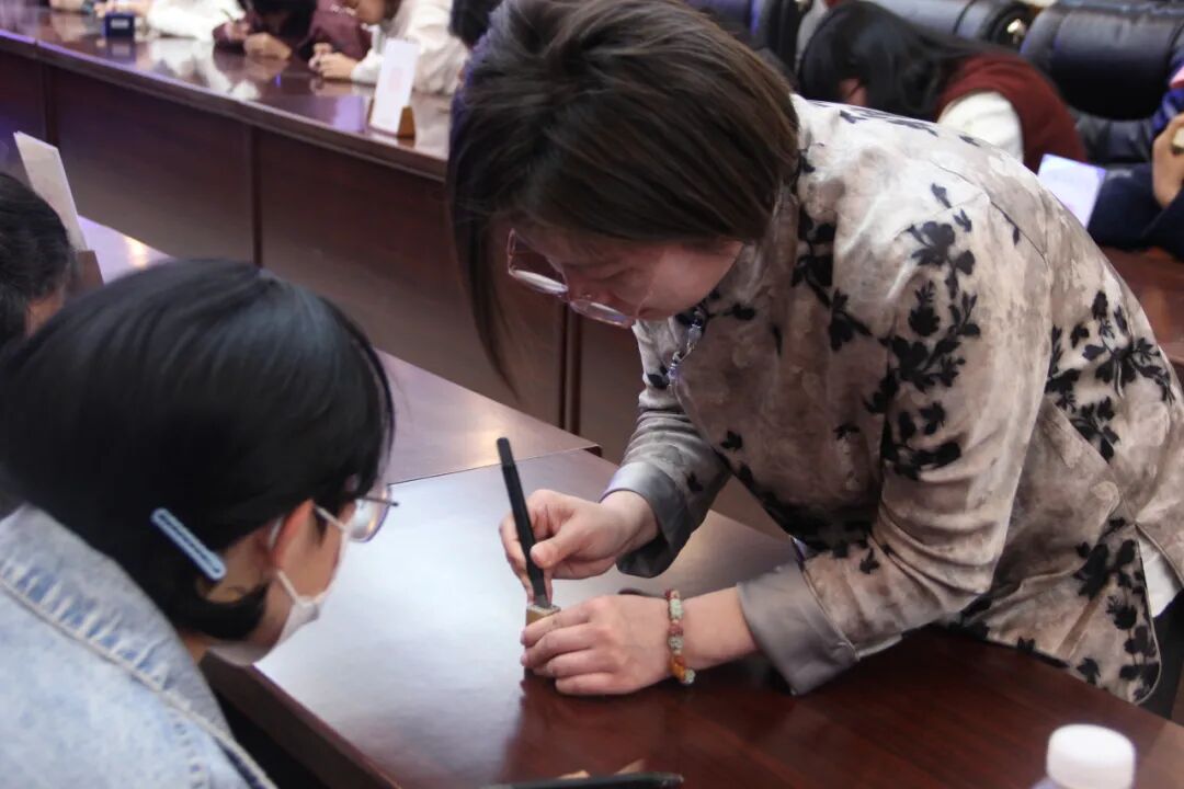实践环节,郭老师亲自示范篆刻技巧,从刀具使用到线条镌刻,耐心指导每一个步骤。同学们亲手刻下属于自己的印章,收获独特的艺术成果。