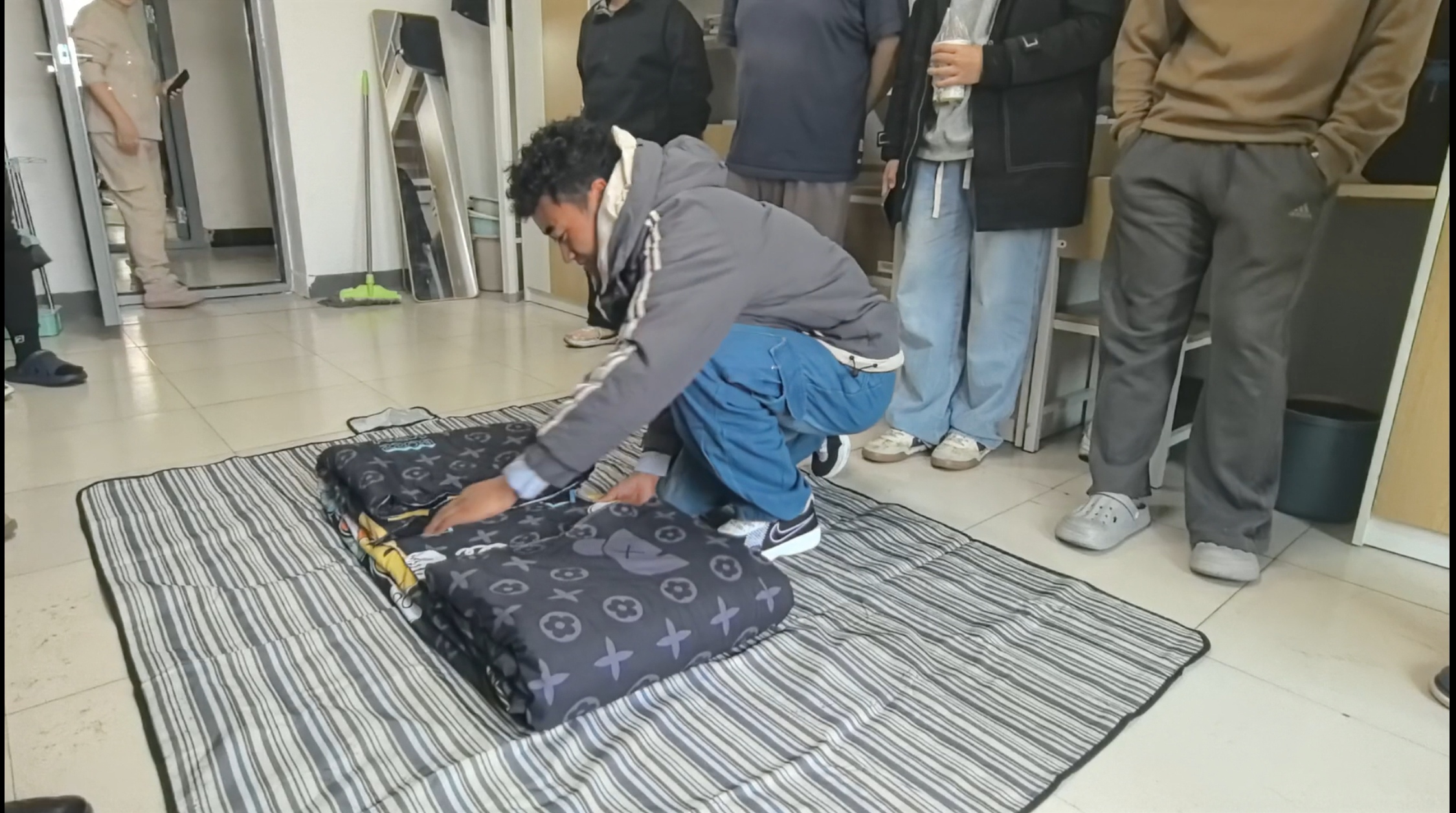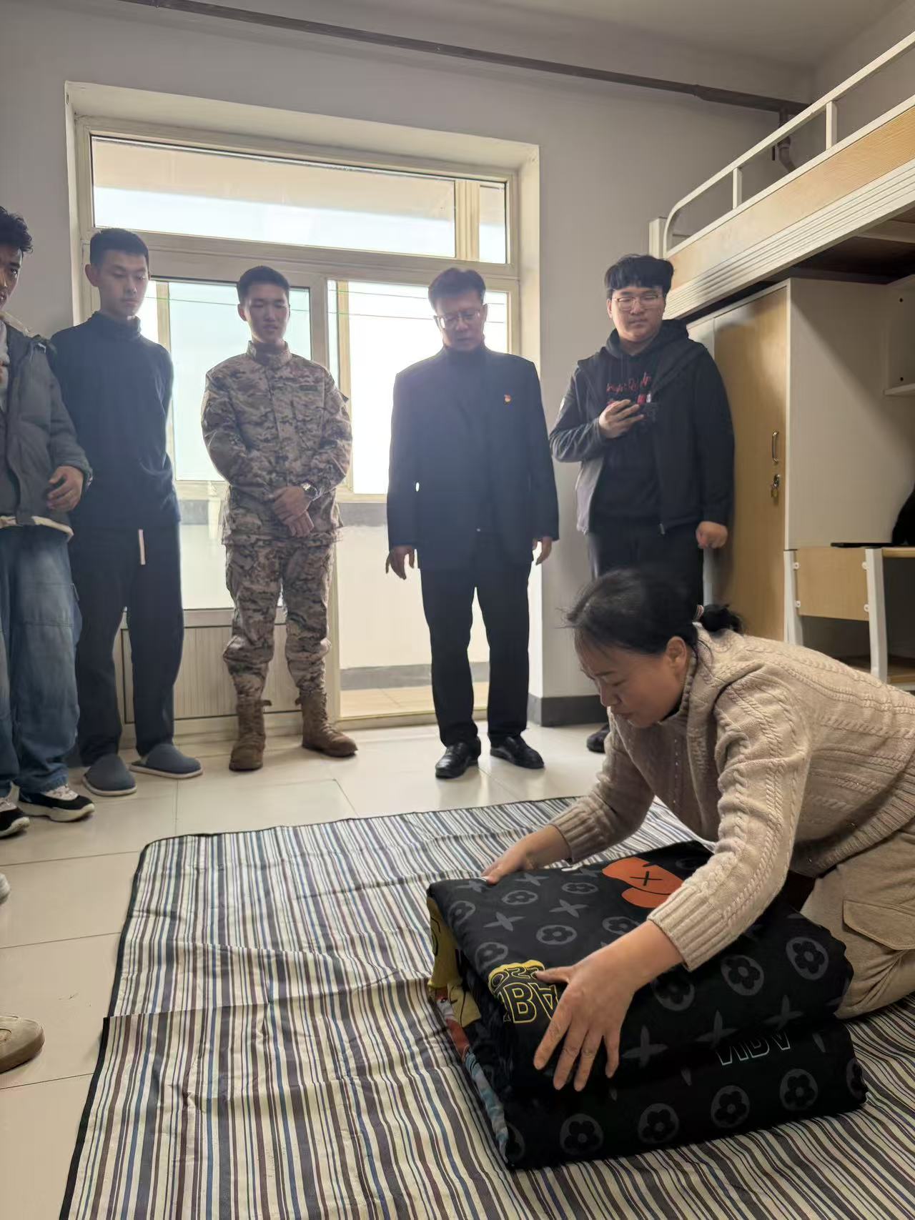 示范结束后,实操演练环节迅速拉开帷幕。新生们跃跃欲试,回到各自床位动手实践,宿舍内一派热火朝天的学习景象。面对“边角不整齐”“整体不够方正”等问题,李勇副书记不时驻足观察,耐心叮嘱同学们“细节决定成败,内务整理也是锤炼意志的过程”;辅导员王一夫、杨海艳穿梭于各宿舍,采取“一对一”指导模式,从捏角力度到修边技巧逐一纠正,细致解答新生疑问。同学们相互切磋、互帮互助,在反复尝试与调整中,手中的被子渐渐有了规整形态,宿舍面貌逐步焕新。