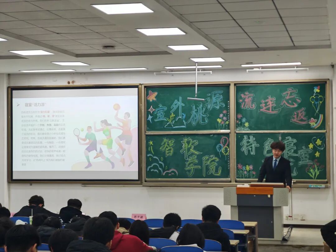 活动开始,来自不同寝室的代表依次登台,用生动的语言、鲜活的画面,分享了属于自己“小家庭”的独特故事。“书香筑梦寝室”的代表通过PPT展示了寝室日常阅读场景,视频中大家热烈讨论书籍内容的画面,尽显浓厚的学习氛围;“青春动能寝室”则以一段热血的运动集锦视频开场,从晨跑打卡到校园赛事,每一个镜头都传递着青春的激情与团结的力量。此外,还有“智趣创新寝室”“墨韵雅舍寝室”等不同类型的寝室依次亮相,每一段演讲都独具特色,每一份展示都充满诚意,赢得了现场师生的阵阵掌声。