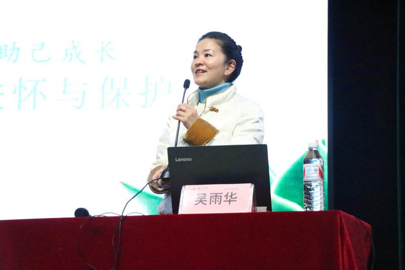 吴雨华以《阳光心态 助己成长 女生的自我关怀与保护》为题,围绕女性身体健康、心理调试和安全意识等热点话题,用“接地气”的语言深入浅出地为广大女生传授前沿的身体健康知识、实用的心理调试技巧以及科学的心理干预方法,帮助女大学生们学会情绪管理,培养积极向上的生活态度,进一步树立自尊自爱自强的观念。在吴雨华医生的带领下,全场女生共同体验了释放压力的身心放松操。