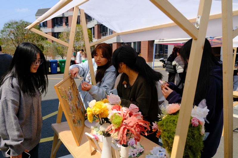 各个社团化身“社区文化使者”,在“生态广场”支起创意展台。烘焙社成员现场制作手工饼干、瑞士卷、泡芙等烘焙产品;花卉协会将林业美学融入艺术作品《花间梦灵》,让参与者近距离感受自然奥秘;物候协会指导师生用废弃树枝制作书签,实践“变废为宝”的可持续理念,并在现场教学如何分辨植物。