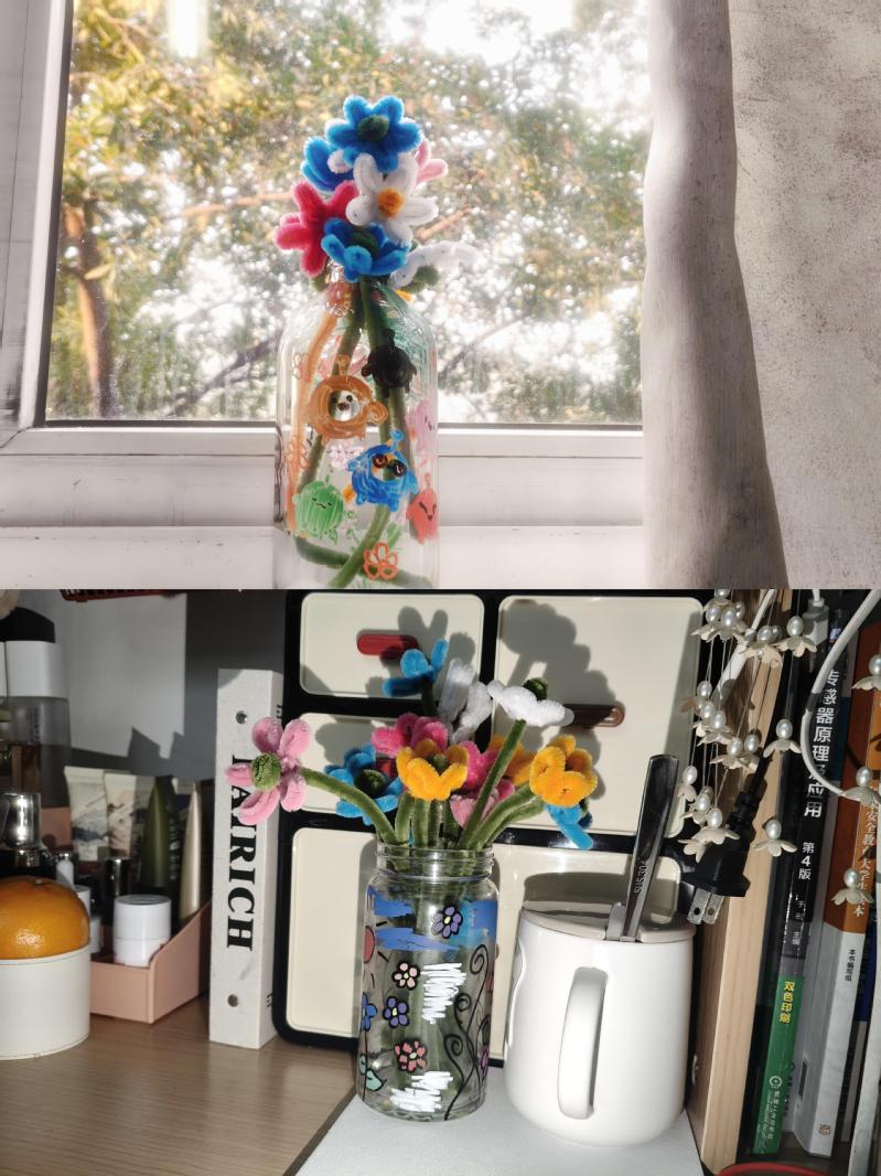 在手绘瓶子之余,同学们将五颜六色的绒条扭、折、缠、绕,制作出郁金香、向日葵等栩栩如生的花朵。看似简单的扭折动作,实则考验耐心与手感,稍有不慎便要拆掉重来,这正是“匠心”对细节的执着。当亲手扭制的“花”插入亲手绘制的花瓶中,一件件饱含温度的手工作品便宣告诞生。