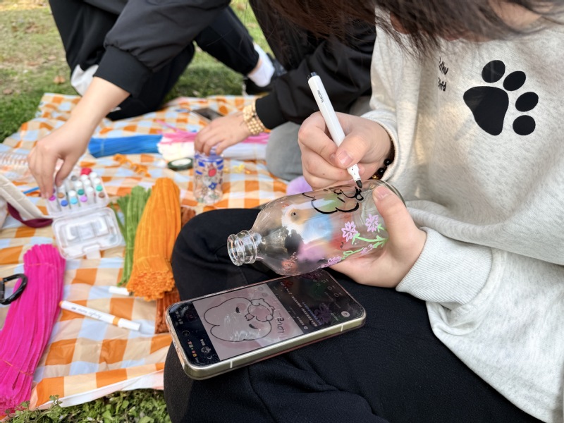 活动现场,平日宅在宿舍的同学们纷纷走出房门,在丽职清渠共同体验手作的魅力。大家以废弃的空瓶为画布,用丙烯颜料精心描绘。从构图设计到调色上色,每一笔都需要凝神静气、细致打磨——这正是工匠精神中“专注”与“精益求精”的生动体现。原本即将丢弃的瓶子,在同学们的巧思巧手下,蜕变为独一无二的艺术品。
