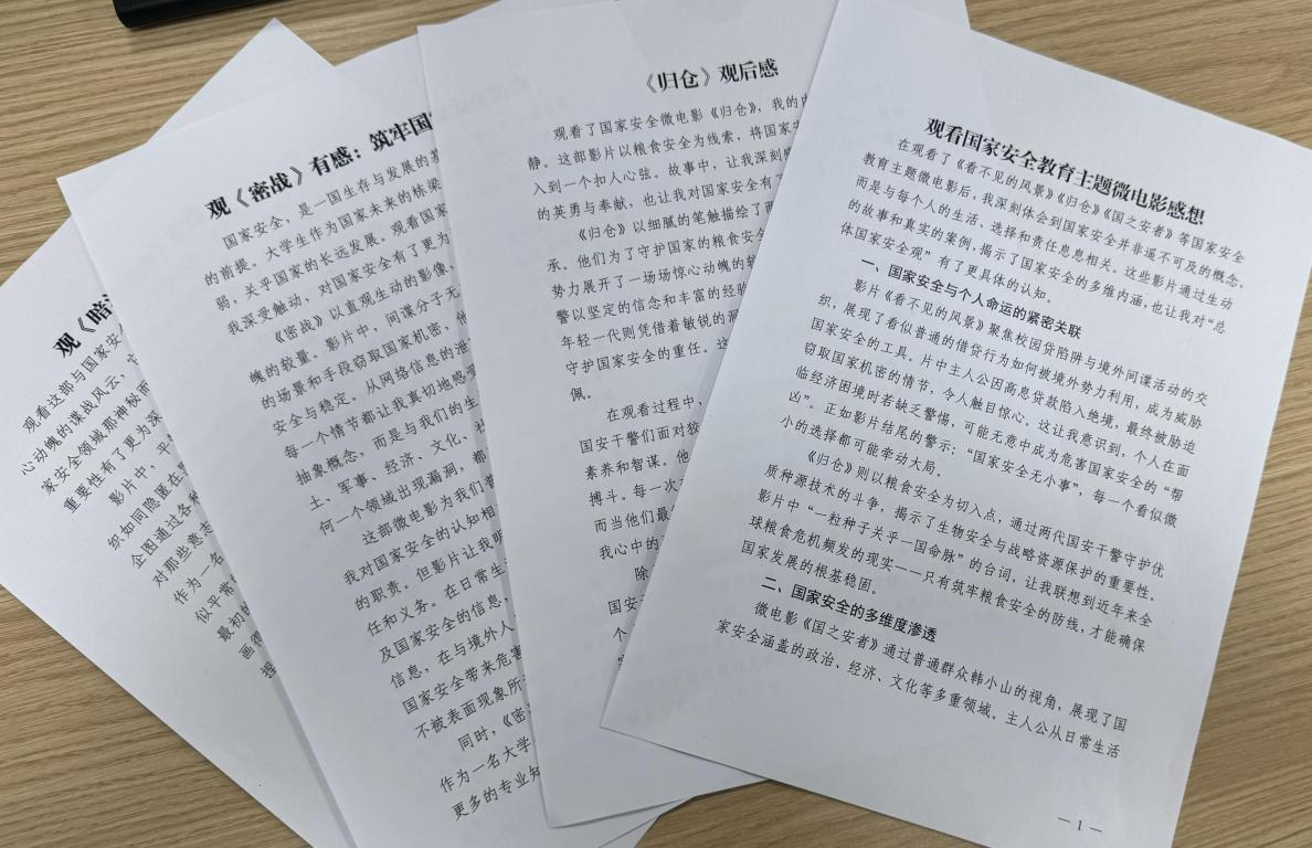 系部组织学生观看了国家安全主题微电影《国之安者》等,通过观后感征集活动,以文字形式表达对此次活动的深化理解。许多同学提到,作为药品食品专业的学生,未来将肩负保障公众健康和安全的责任,必须时刻绷紧国家安全这根弦,从点滴做起,为国家安全添砖加瓦。