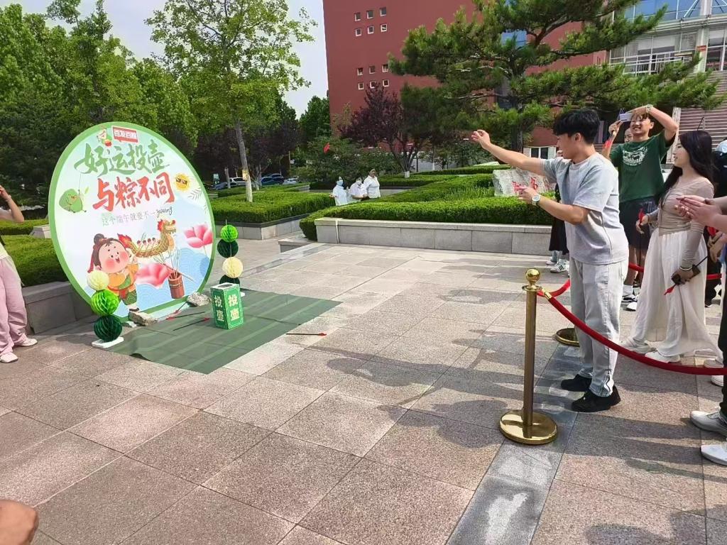 投壶游戏区同样趣味盎然。作为中国古代传统礼仪和宴饮游戏,投壶吸引了众多师生跃跃欲试。王栋同学负责引导、讲解游戏规则,大家手持箭矢,瞄准壶口,全神贯注投掷,欢呼声、惋惜声此起彼伏,现场充满欢乐与活力,师生们在游戏中体验到古人的雅趣,也加深了对传统民俗文化的理解。