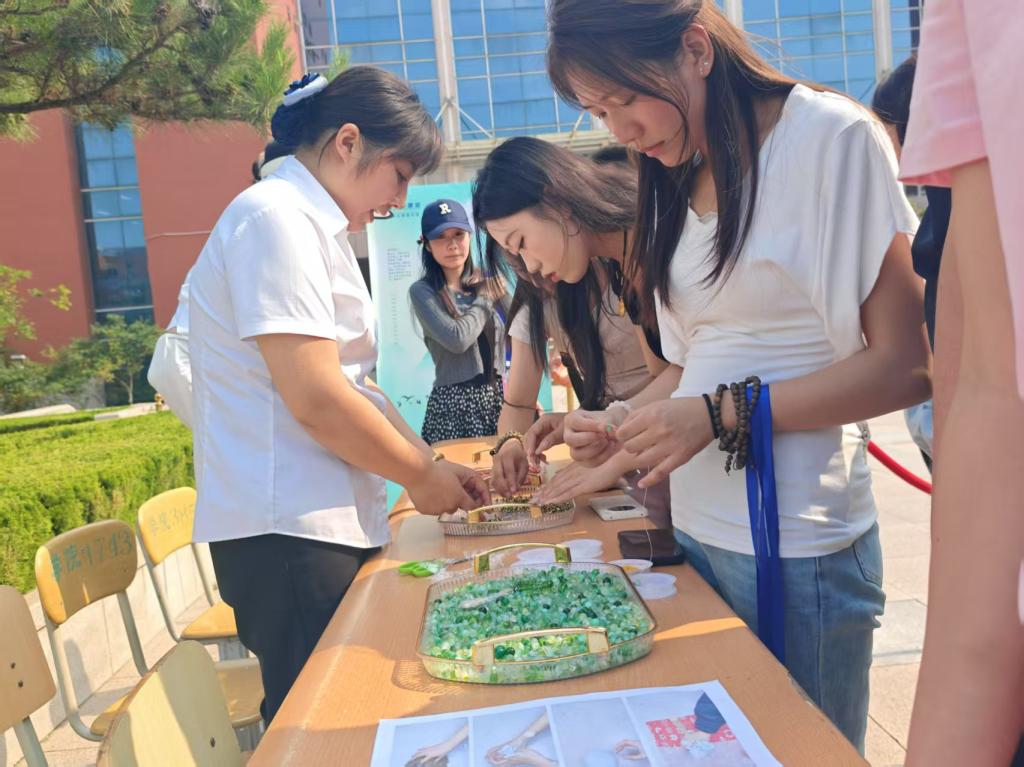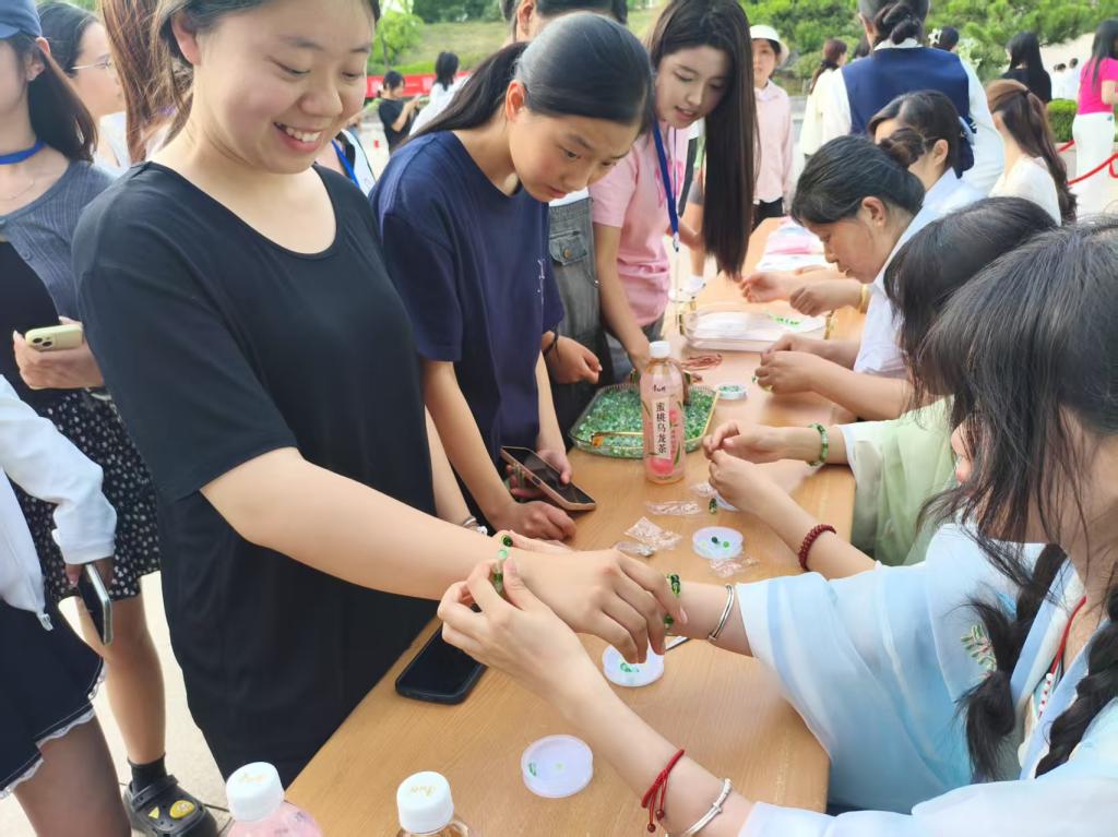 伴随着场地的布置,各色各样的珠子已经在桌上摆放整齐,在阳光的照射下闪烁着耀眼的光芒。活动一开始,陆陆续续有同学经过了DIY手串的摊位,被琳琅满目的珠子所吸引。即使烈日当空,仍有一些热爱手工制作的同学们顶着高温投入到手串制作中,晶莹的汗珠与璀璨的珠子相映成趣,成为最动人的风景。教学引导员亓美带领师生们用端午主题珠子制作手链或挂饰。五彩珠子在大家指尖流转,不一会儿,精美的手工作品便一一呈现,这些作品既美观又富有节日特色。