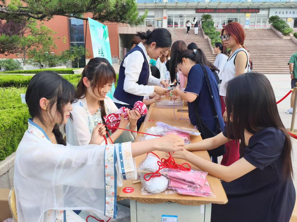 五彩绳DIY区中,五彩丝线在师生们指尖翻飞。教学引导员王娇引导大家相互交流编织技巧,将五种颜色的丝线巧妙串编,制作出一条条精美且寓意吉祥的五彩绳。佩戴五彩绳是端午传统习俗,象征着祈福纳吉,师生们将这份美好戴在手腕,为节日增添一抹亮丽色彩。