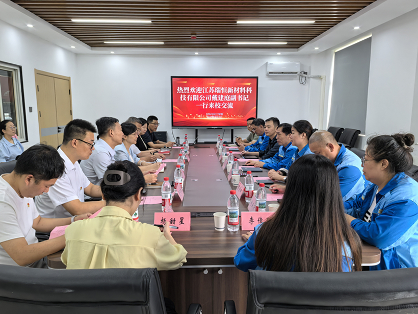 9月3日上午,江苏瑞恒新材料科技有限公司党委副书记戴建庭一行9人来我校开展产教融合交流活动。副校长张萍,继续教育管理处处长刘世金,材料与化工学院书记汤小平、院长刘红婷及相关教师参加活动。