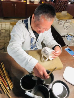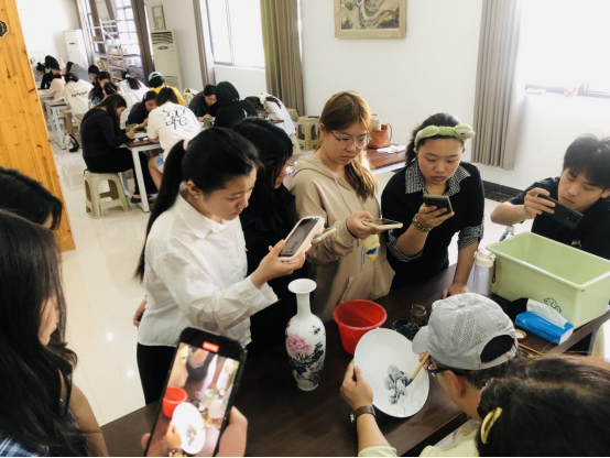 分水技法:通过调配不同浓度的青花料水,以鸡头笔引导料水在坯胎上自然流动,形成深浅、虚实交错的层次感,使单色钴蓝呈现出“墨分五彩”的视觉效果,分水带来层次感和立体感需要画师精准控制笔触与料水浓度。在老师的逐一指导下,同学们对釉下彩的学习进行了深度体验,结合传统工艺与个人审美进行创作实践。