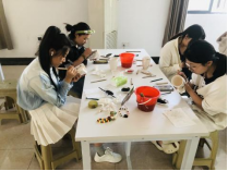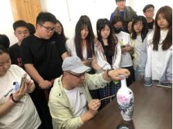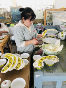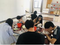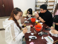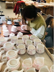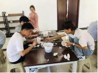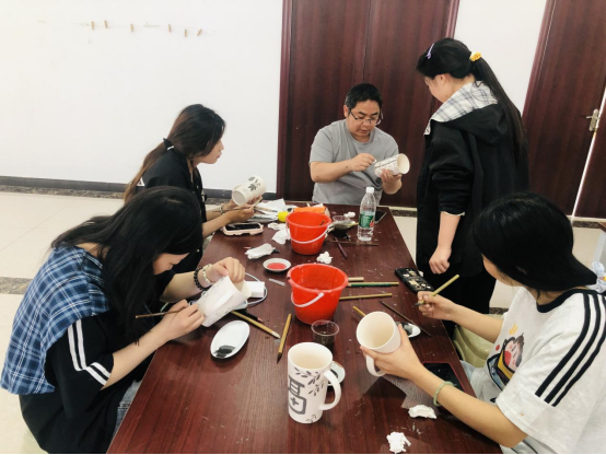 在画千艺研学基地,同学们学习认真研习釉上新彩工艺。老师详细介绍新彩技法:演示如何正确使用樟脑油进行稀释和清洗毛笔,油料和水料结合使用的方法,展示牡丹花与叶画法以及如何在陶瓷上进行层次变化和浓淡变化的处理,不同颜色的烧制温度区间,何使用海绵和彩笔进行颜色的渐变处理等新彩技法细节。