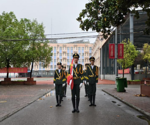 随着主持人胡静蕾宣布升旗仪式开始,国旗护卫队的队员们伴着清晨的微风,迈着铿锵的步伐,护送国旗入场。五星红旗在朝阳中冉冉升起,师生目光坚毅,全体肃立,奏唱国歌,以庄严的注目礼表达对祖国的热爱。