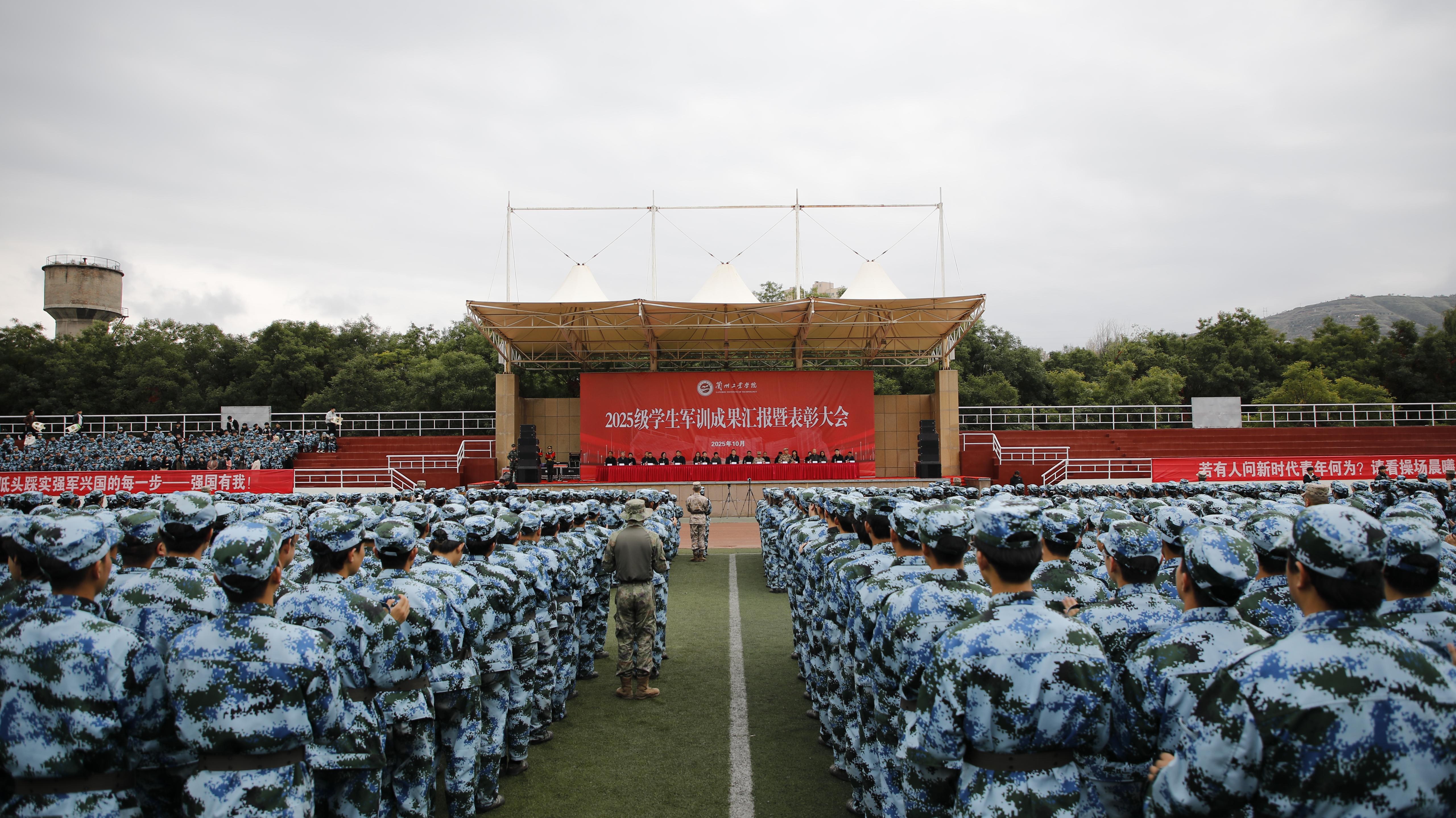 刘新辉发表讲话。他充分肯定了同学们在军训中的优异表现,并代表学校向顺利完成军训的全体新生表示祝贺,向承训部队及教官和参与军训工作的教职员工致以衷心感谢。刘新辉向即将正式开启大学生涯的全体学生提出希望,一是将军训中培养的坚韧意志转化为勤奋学习的持久动力,以“咬定青山不放松”的韧劲钻研专业、提升素质。二是将严守纪律的作风融入日常行为,自觉遵守校纪校规,共建文明有序的校园环境。三是将团结协作的精神投入集体生活,珍惜荣誉、互助成长,增强集体凝聚力。四是将爱国报国的情怀升华为奋斗志向,把个人理想融入国家发展大局,努力成长为德智体美劳全面发展的社会主义建设者和接班人。