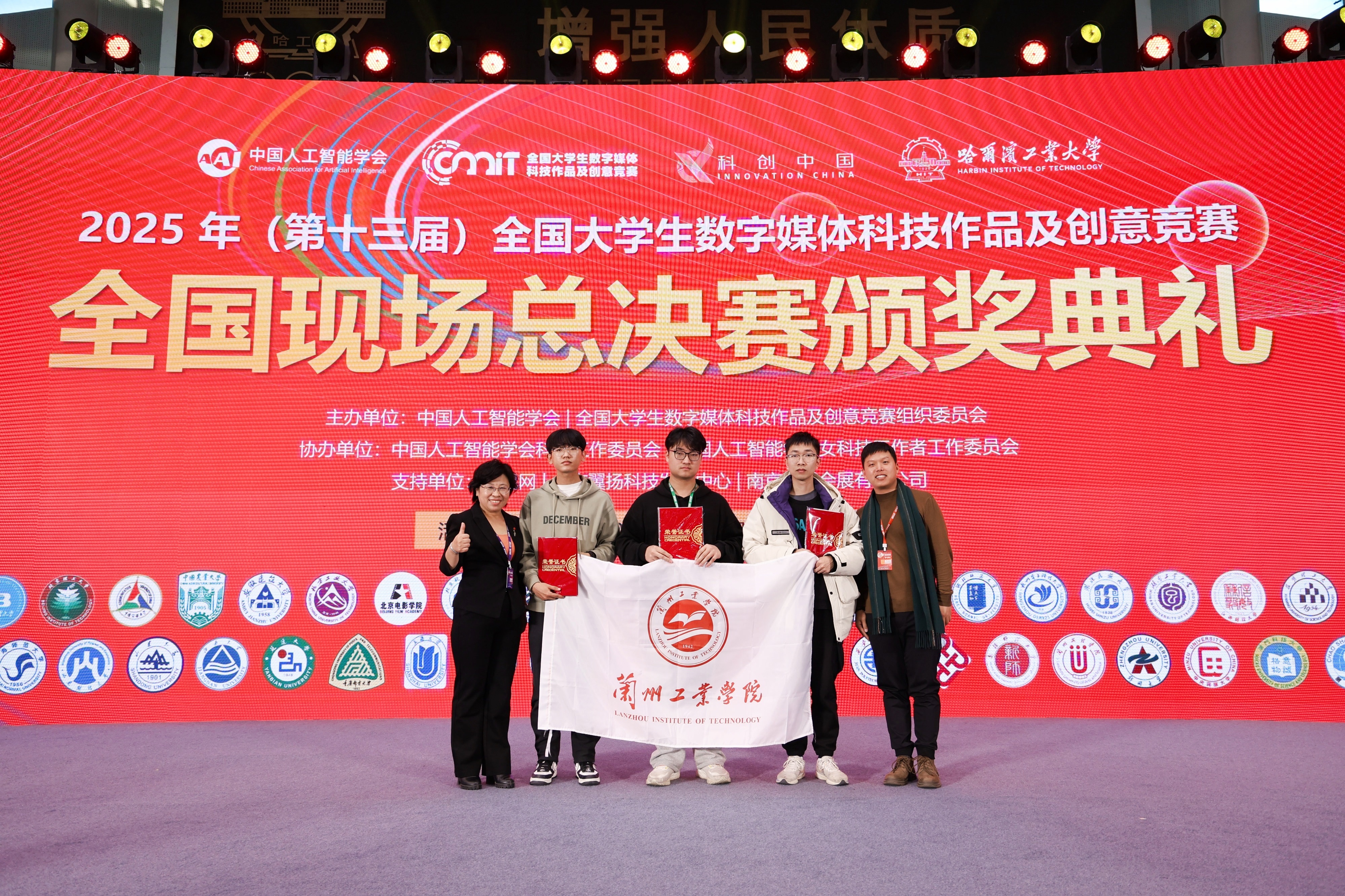 10月26日,2025 年(第十三届)全国大学生数字媒体科技作品及创意竞赛全国现场总决赛在哈尔滨工业大学圆满落幕。经过激烈角逐,我校师生共斩获国赛一等奖2项、二等奖2项,展示出我校学子在数字媒体技术与创意设计领域的深厚实力、创新活力、竞技风采和数媒科创才华。