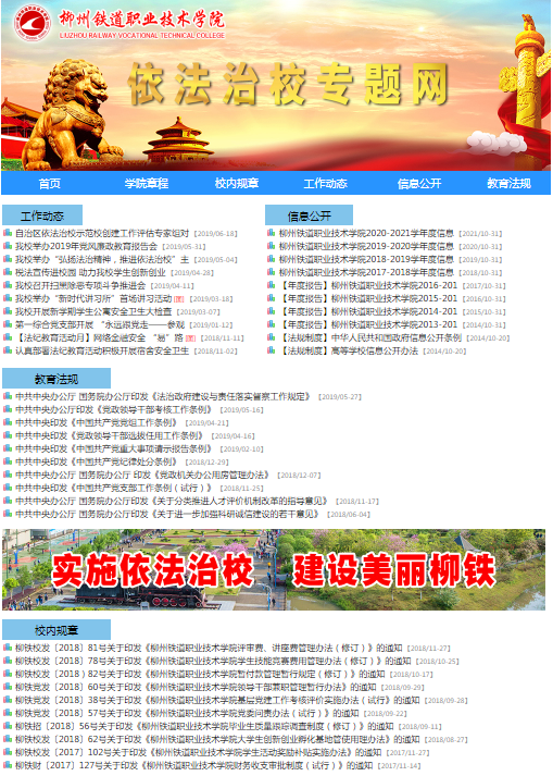 自柳州铁道职业技术学院第二次党代会以来,我校依据党中央及自治区教育厅关于依法治校的要求,并结合校园的变化发展和师生的需求,与时俱进,改革内部治理结构及运行机制,积极推进依法治校向纵深推进。同时,我校强化依法治校的执行,从依法治校责任体系、管理制度体系、内部治理体系、权益保障体系等方面综合施策,获得了较好实效。