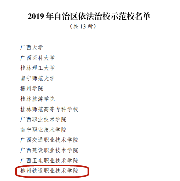 2019年学校获评“广西依法治校示范校”,开展普法知识学习和法制宣传教育活动50余场,受教育师生达20000余人次,“柳铁青年说”连续两年成为广西社会科学大讲坛重要内容。