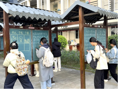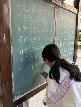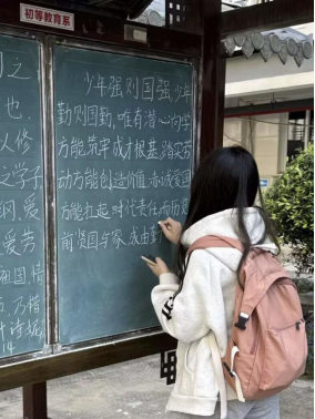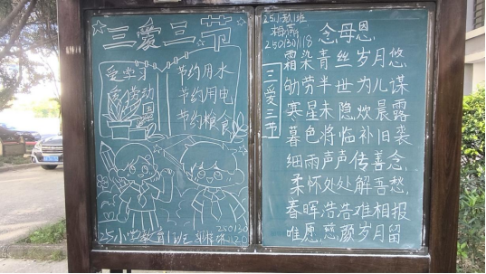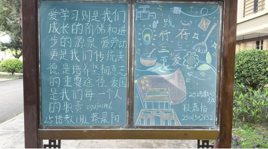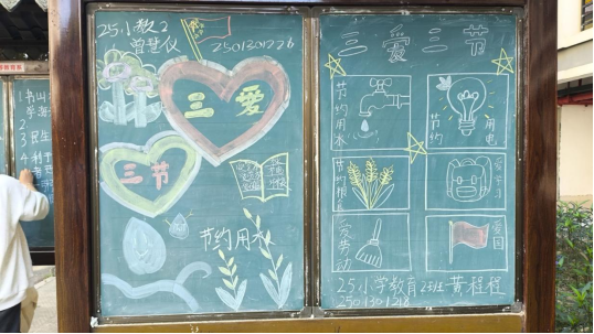 三爱铸魂,三节笃行。在全面建设社会主义现代化国家的新征程中,我们始终坚守“德育润心,美德铸魂”的初心。活动现场,一方方墨绿色黑板前人头攒动,学子们手握粉笔凝神创作,笔尖在黑板上轻舞翻飞间,满是对“三爱三节”的热忱践行。同学们以遒劲楷书书“三爱”——爱祖国燃壮志、爱学习求新知、爱劳动创价值,笔锋藏少年担当与实干热忱;简笔勾勒绘“三节”——挥汗劳作、惜水光盘,寥寥数笔尽显美德风采;娟秀字迹抒践行——晨读钻研、拾粒惜餐、关阀护流,字字诠释理念真谛。粉笔粉尘簌簌,如美德种子扎根心田;笔墨流转间,每道痕迹皆是学子践行“三爱三节”、传递新风的赤诚告白,让美德在笔墨中落地生根,让新风随青春共展芳华。