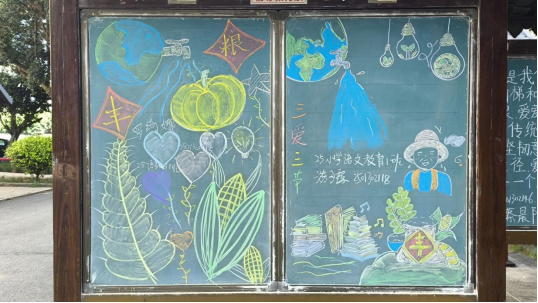 每一幅作品都藏着美德初心与创意巧思:“三爱三节践行录”以绿、蓝为主色调,用“勤学善思”“躬身劳作”“惜水护源”“光盘惜粮”“节电节能”的童趣插画,将抽象的美德理念化作鲜活场景;“践行三爱,恪守三节”主题板书以粉笔勾勒简约线条,绘出晨读学子、田间耕者、节水标识等生动元素,尽显践行美德的日常之美。文字与画面的碰撞,让“三爱三节”的要求直抵心灵,更让“以小行践大德,以少年赴新程”的信念愈发坚定。