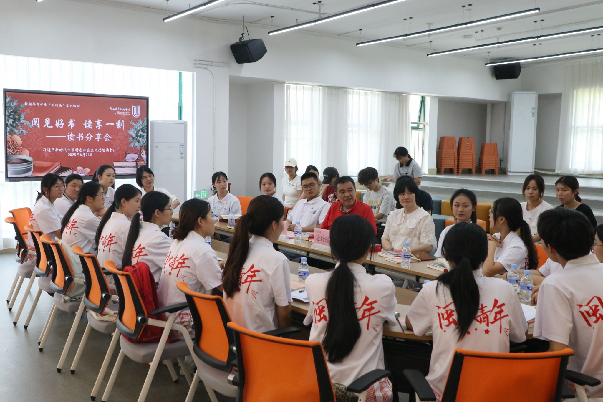 6月24日,我校习近平新时代中国特色社会主义思想读书社在万源楼龙标大学生双创孵化基地路演厅举办“阅见好书 读享一刻”读书分享会。校党委书记卢伟耀、副校长连玲娜、读书社20余名成员参加了分享会。分享会由读书社指导教师主持。