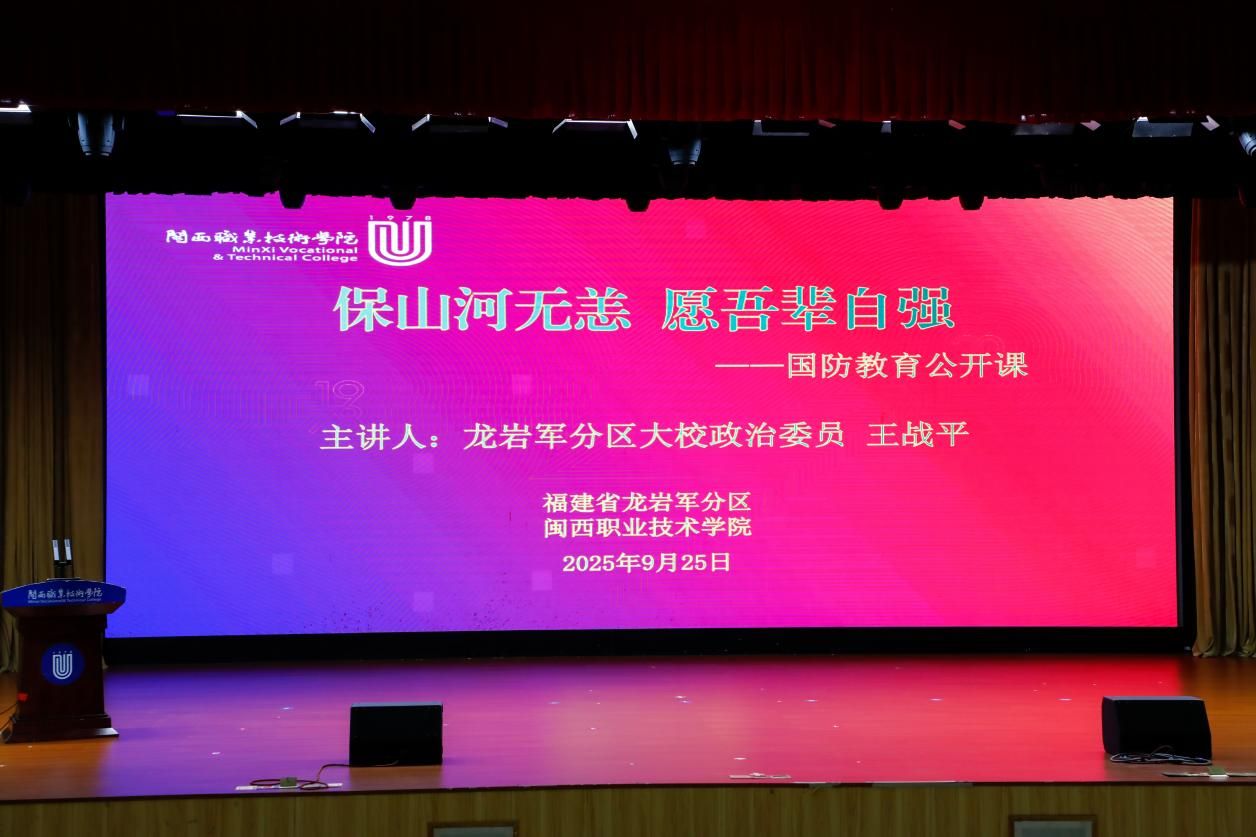 2025年9月25日下午,我校大匠堂热闹非凡,掌声雷动。在抗日战争暨世界反法西斯战争胜利80周年之际,龙岩军分区大校政治委员王战平以“保山河无恙 愿吾辈自强”为题,给师生带来一堂震撼心灵的国防教育公开课。此次公开课系龙岩军分区与我校联合落实2025年“全民国防教育月”活动之一。
